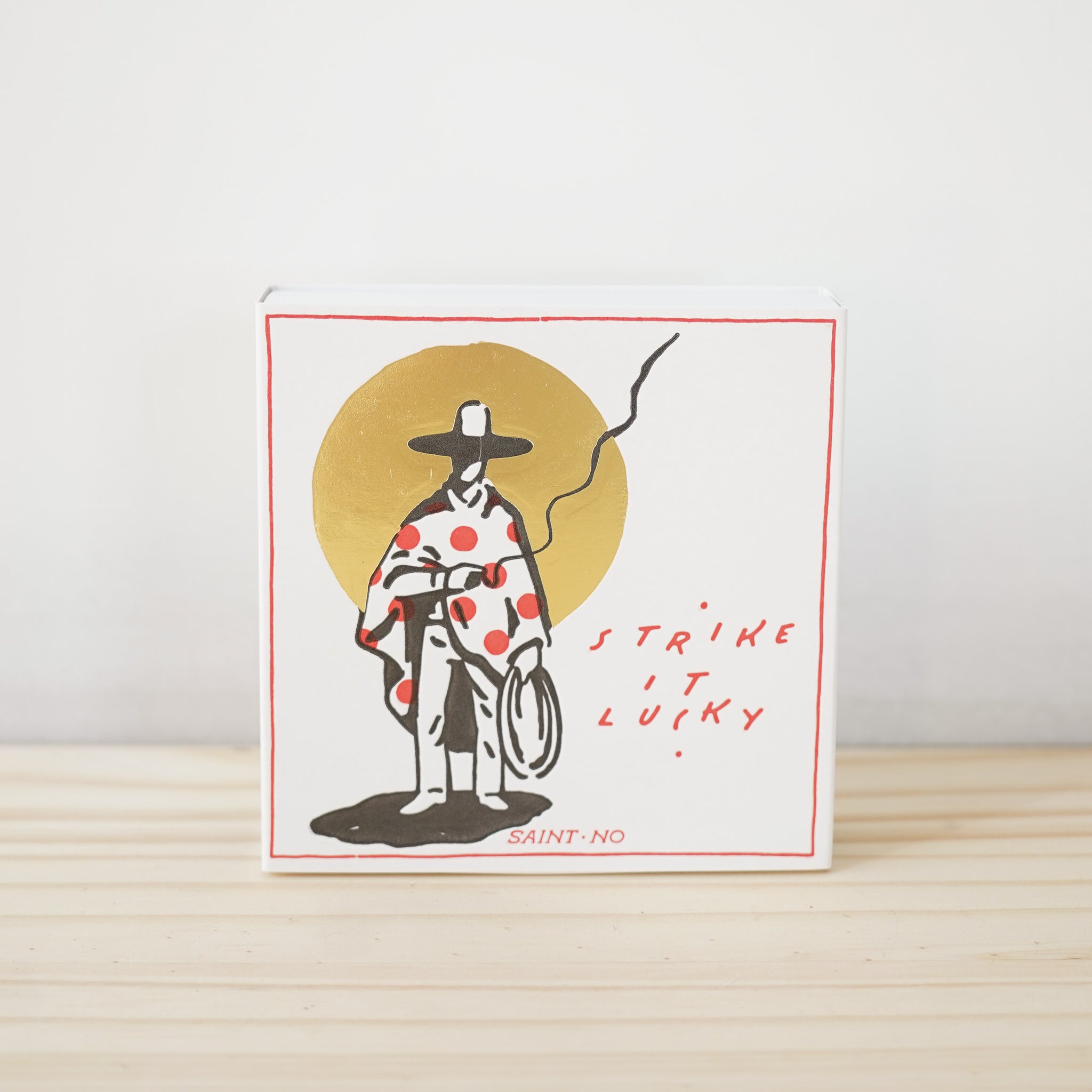 Strike It Lucky by our much loved compedre Saint No or simply "No" to his friends, is one of our favourite designs of his. A mysterious cowboy rocks up before the golden evening sun with a laso in one hand and a ciggie in the other.. At least, we think that's a cigarette.