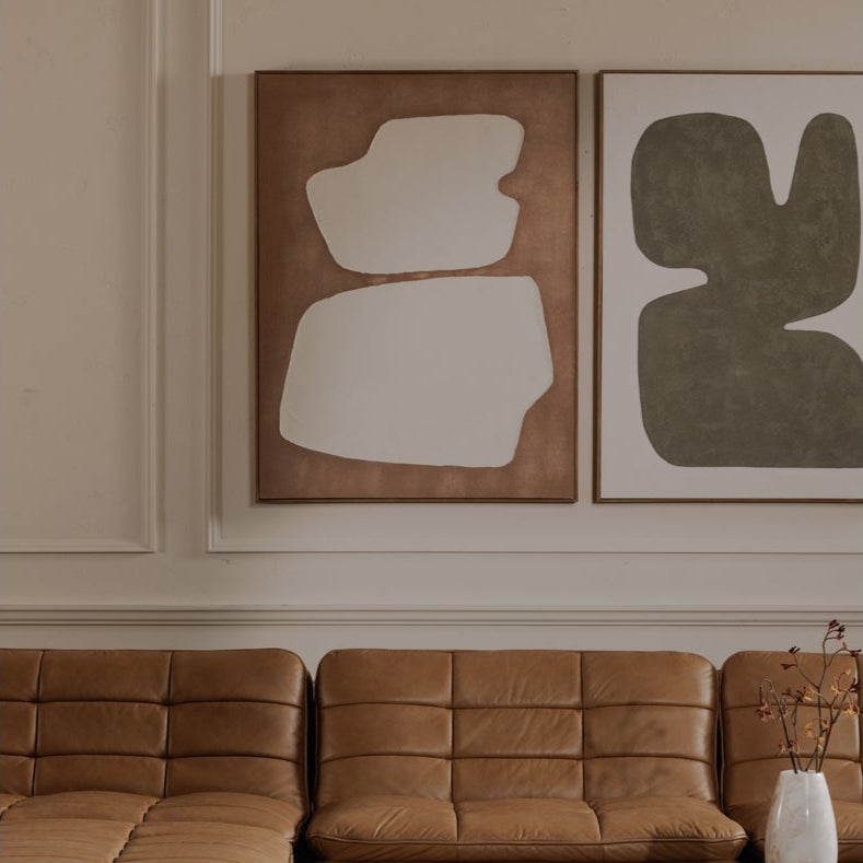 Abstract forms in off-white hues dance against a warm terracotta background, creating a harmonious balance of modernism and transitional appeal in the Sulo framed painting. This abstract, free-form painting is encased in a solid pine frame, adding warmth and natural charm.