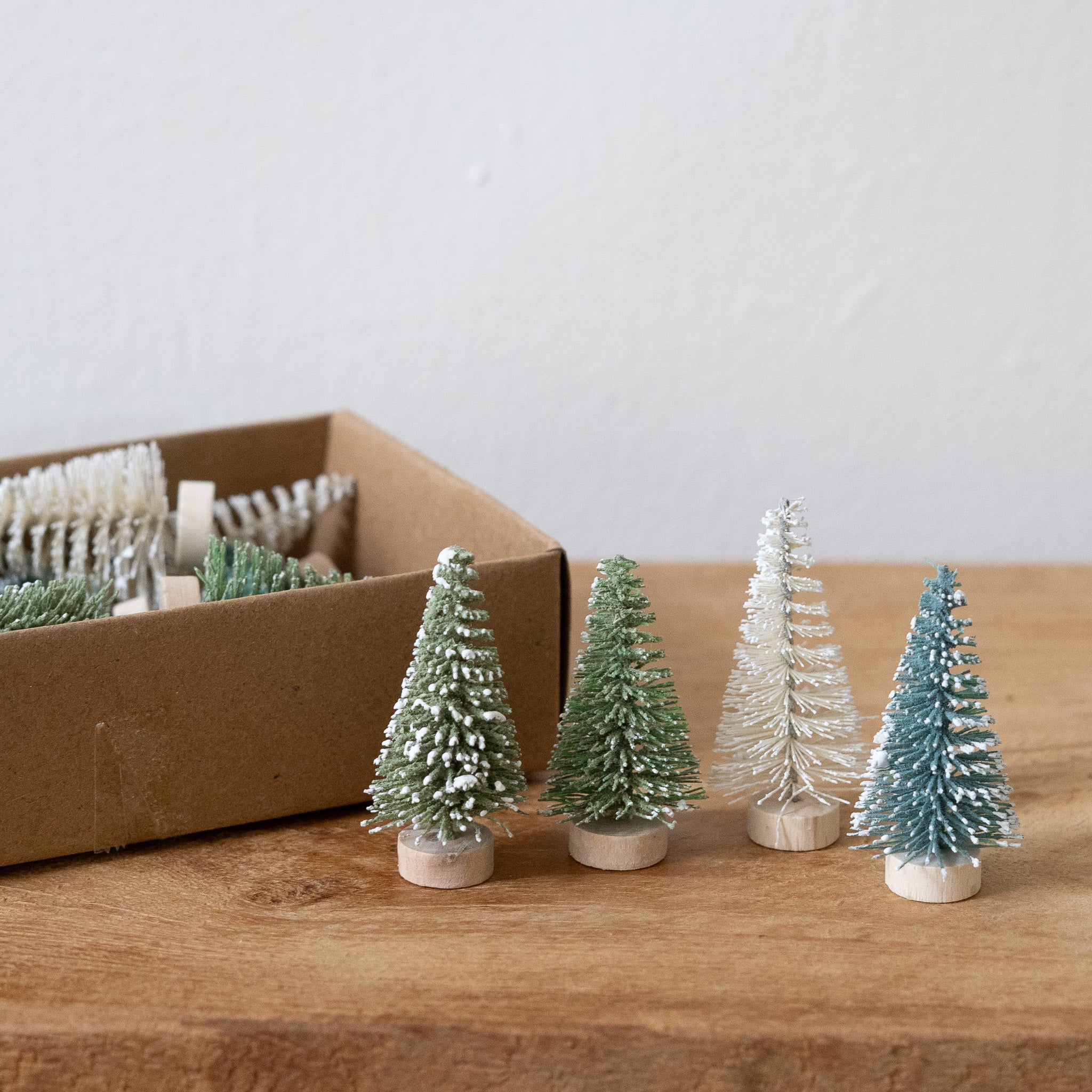 2"H Plastic Bottle Brush Trees w/ Wood Bases, Snow Finish, Blue, Cream & Mint Color, Boxed Set of 24