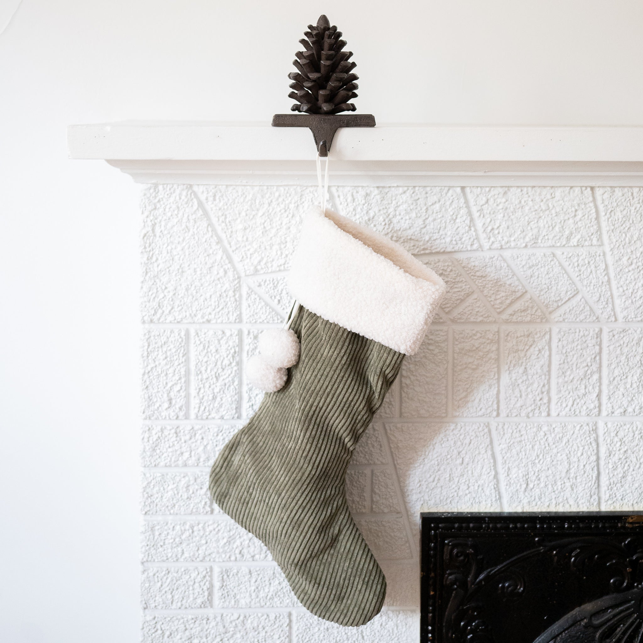 Light green corduroy stocking with off-white boucle cuff and balls, loop for hanging, 18 in
