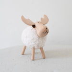 Wood standing reindeer table piece, natural peg legs with green wooly felt body, 4.5 in