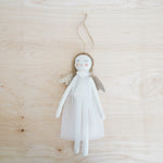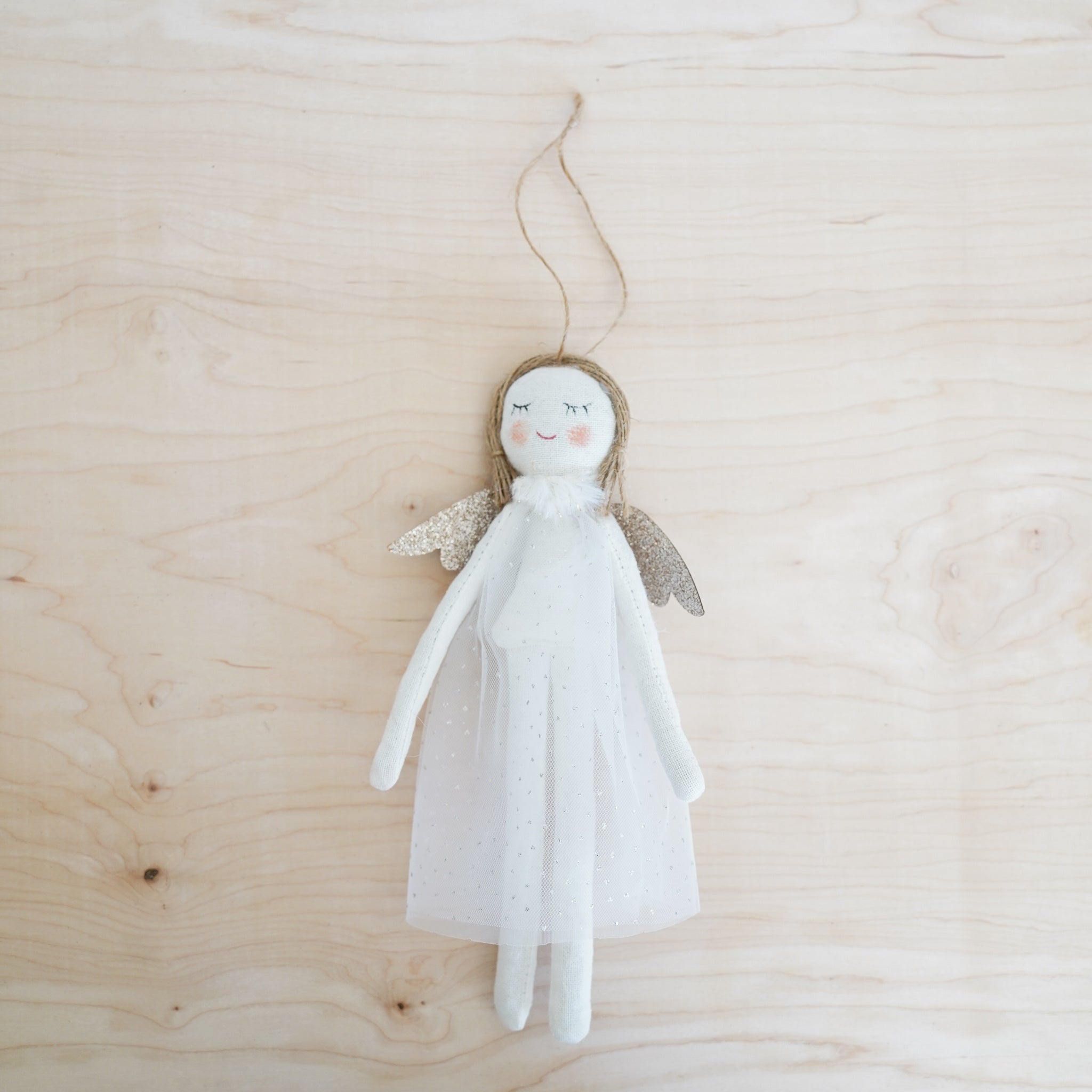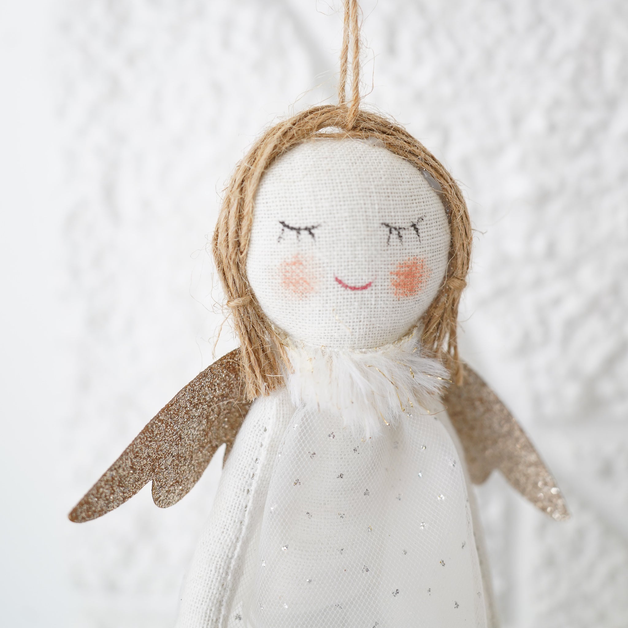 Angel with white dotted dress, glitter wings, jute hair on jute cord ornament 9.1 in