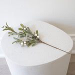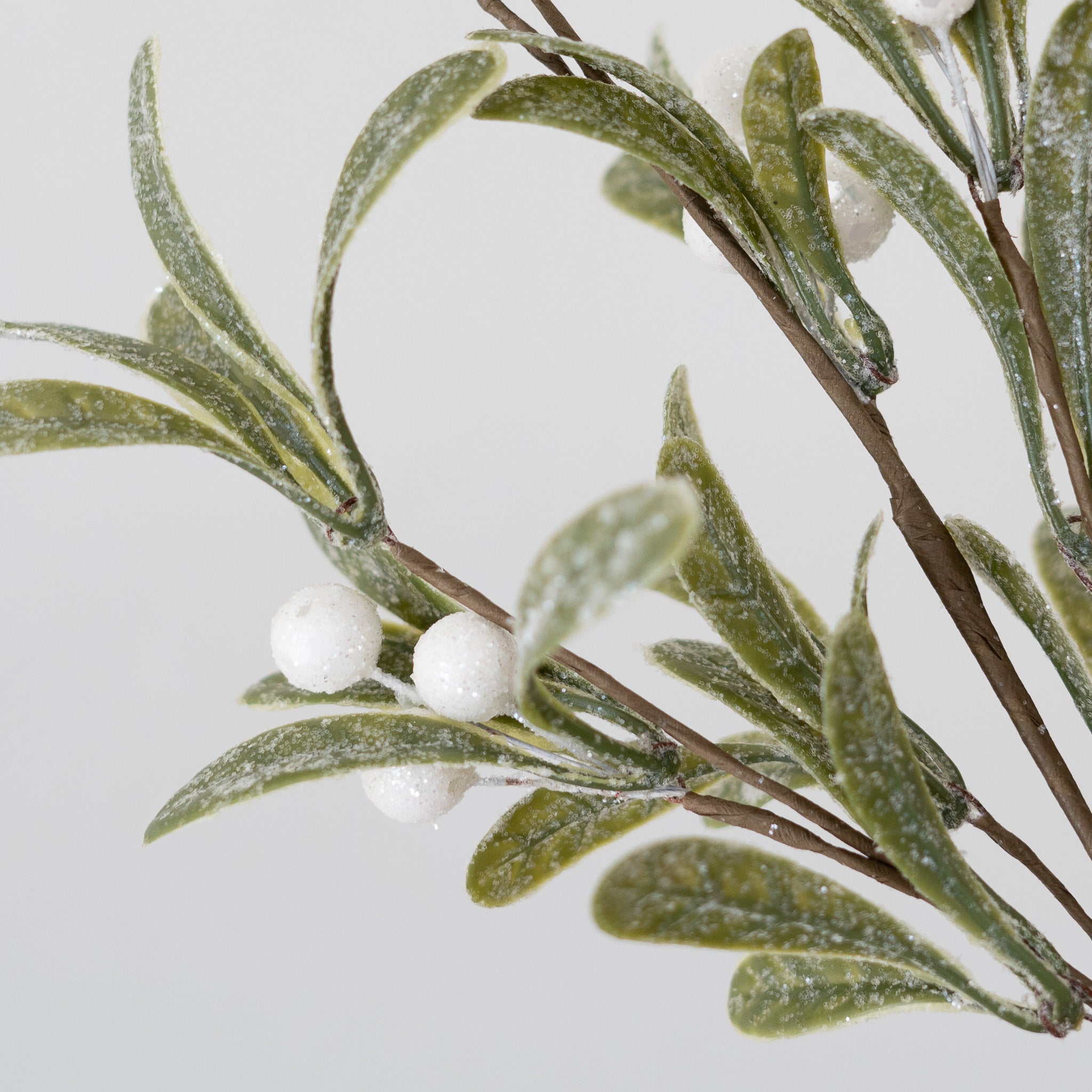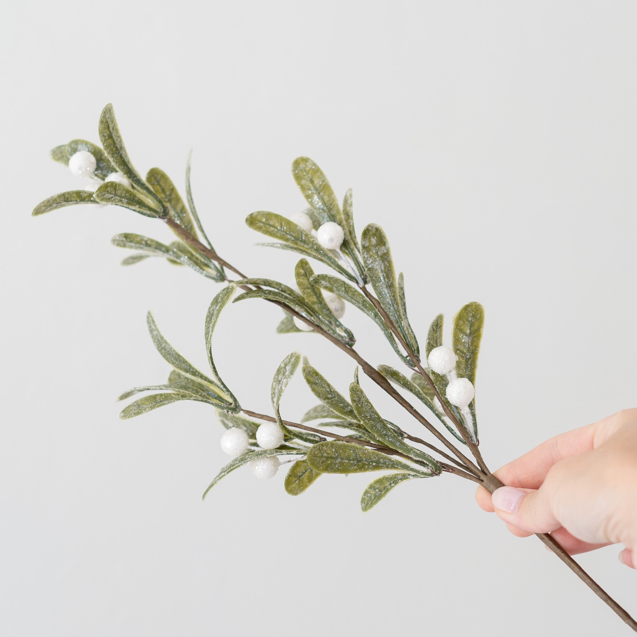 Add some seasonal flair to your bouquets, wreaths, decorative displays and more with this realistic-looking Medium Mistletoe Branch. Crafted out of plastic, this realistic-looking branch is accented with glitter ball berries and a wintry, frosted texture – an elegant complement to accentuate or highlight your holiday decor, or help you steal a holiday kiss!