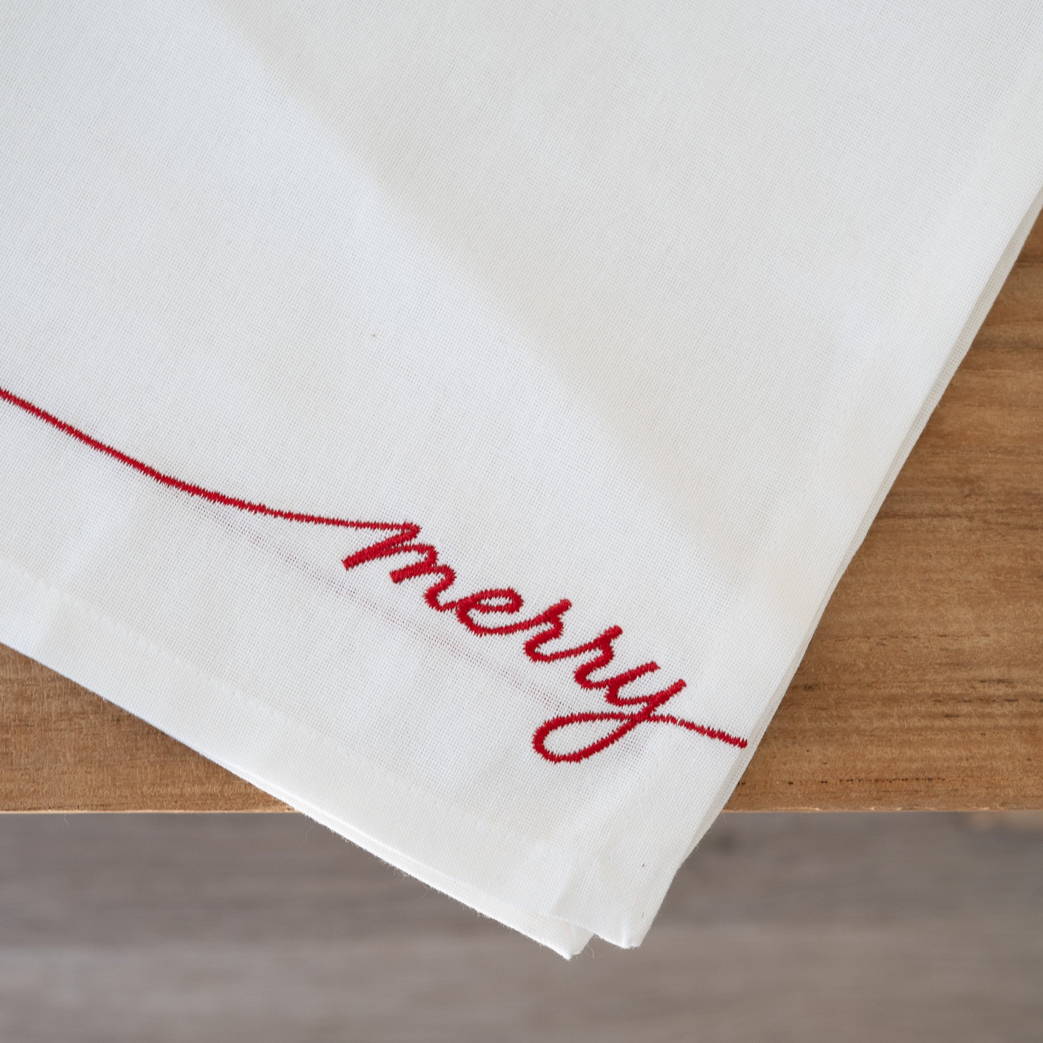 Elevate your holiday entertaining with the help of this Merry Stitch Napkin. Crafted out of cotton, this white napkin is accented with "merry" stitched in red to accent your holiday table and make your entertaining a little merrier.