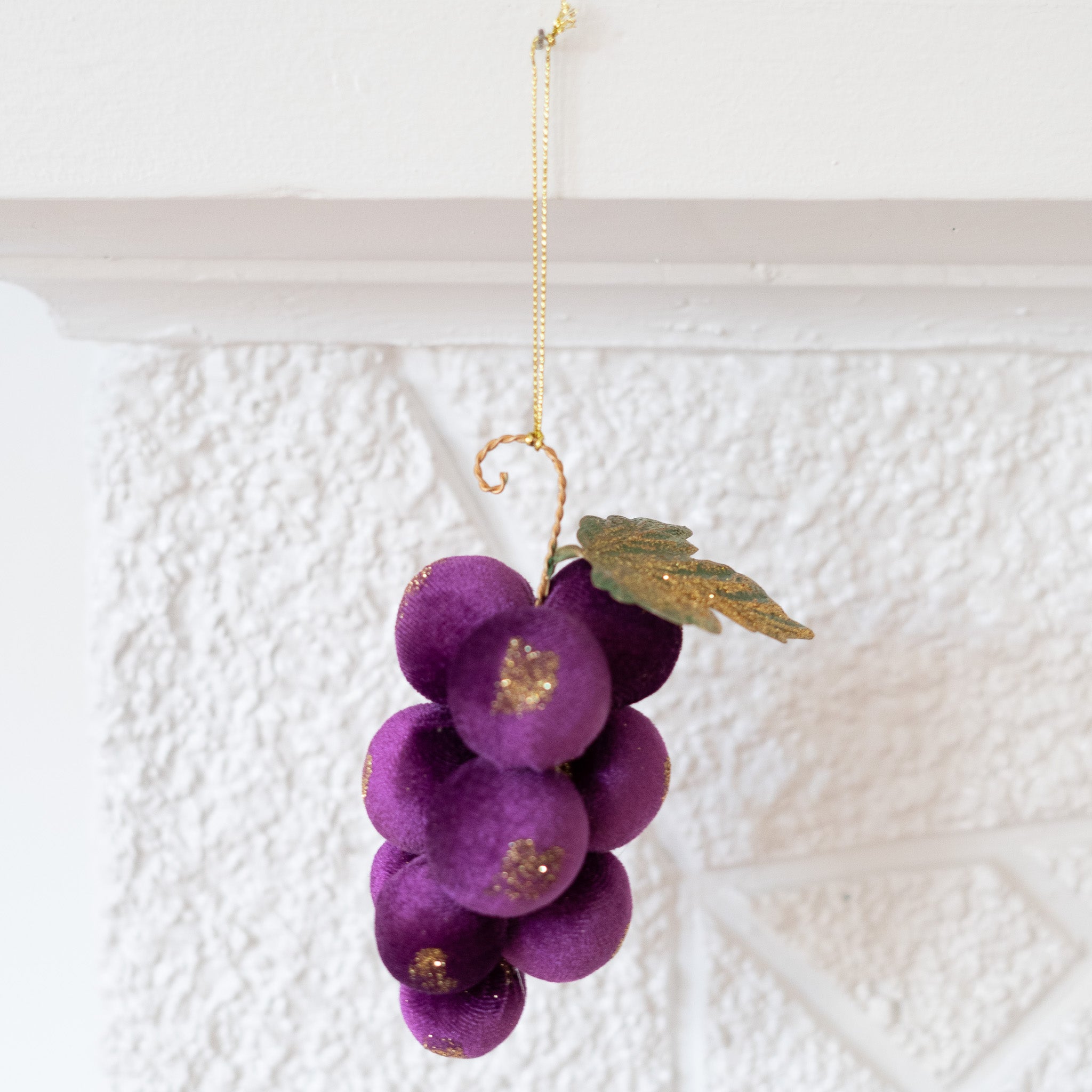 Velvet grape cluster ornament with twisted metal stem and fabric leaf ornament, 6 in