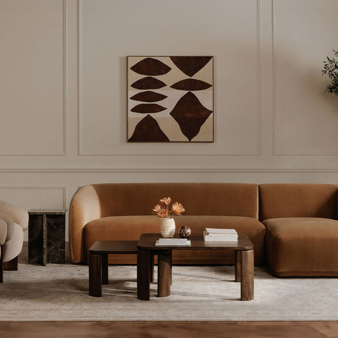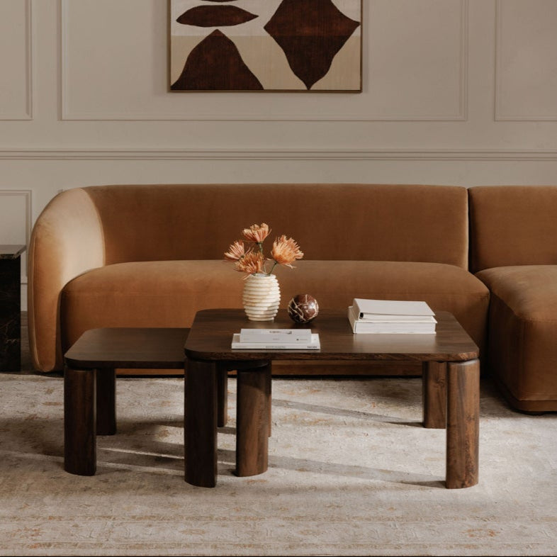 Perfectly paired to seamlessly nest together, the Bailey nesting coffee tables' unique rounded square design with four 1/4 cylindrical legs blend sophistication with practicality. The set's softened edges underscore the rich dark brown mango wood construction.