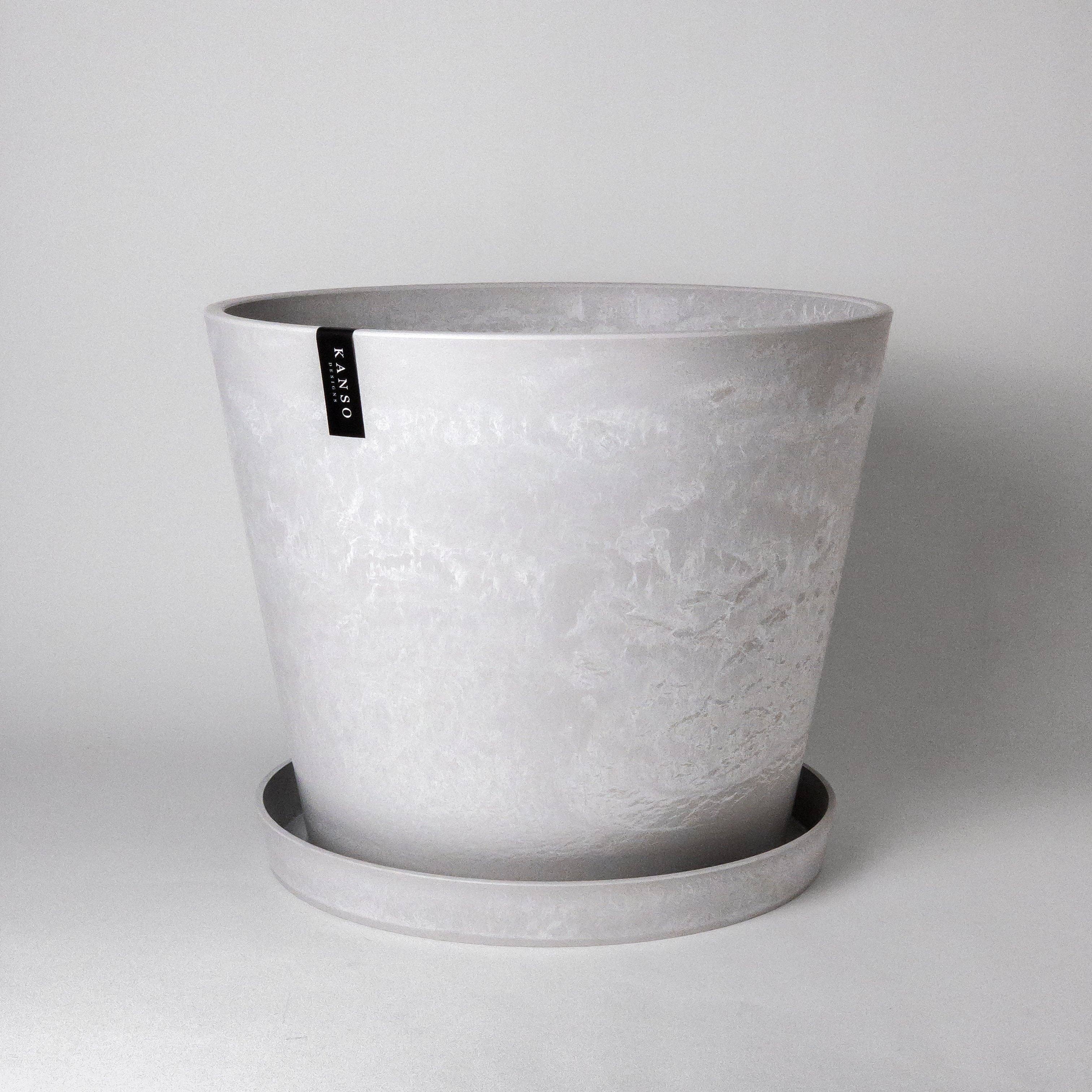 Add a perfect neutral touch to your indoor or outdoor space with our signature stone planters. Its clean and crisp tapered silhouette catches the eye, simplifying the modern look. These planters pair well with tall and lush foliage, like a Fiddle Leaf Fig. Each comes with its own drainage hole and can be bought with or without a saucer. Materials Recycled Plastic | Natural Stone | Wood Dust Porous Hand Finished Details Drainage hole & plug: Yes Indoor/Outdoor Use Frost Proof -50C - 100C Plant not included**