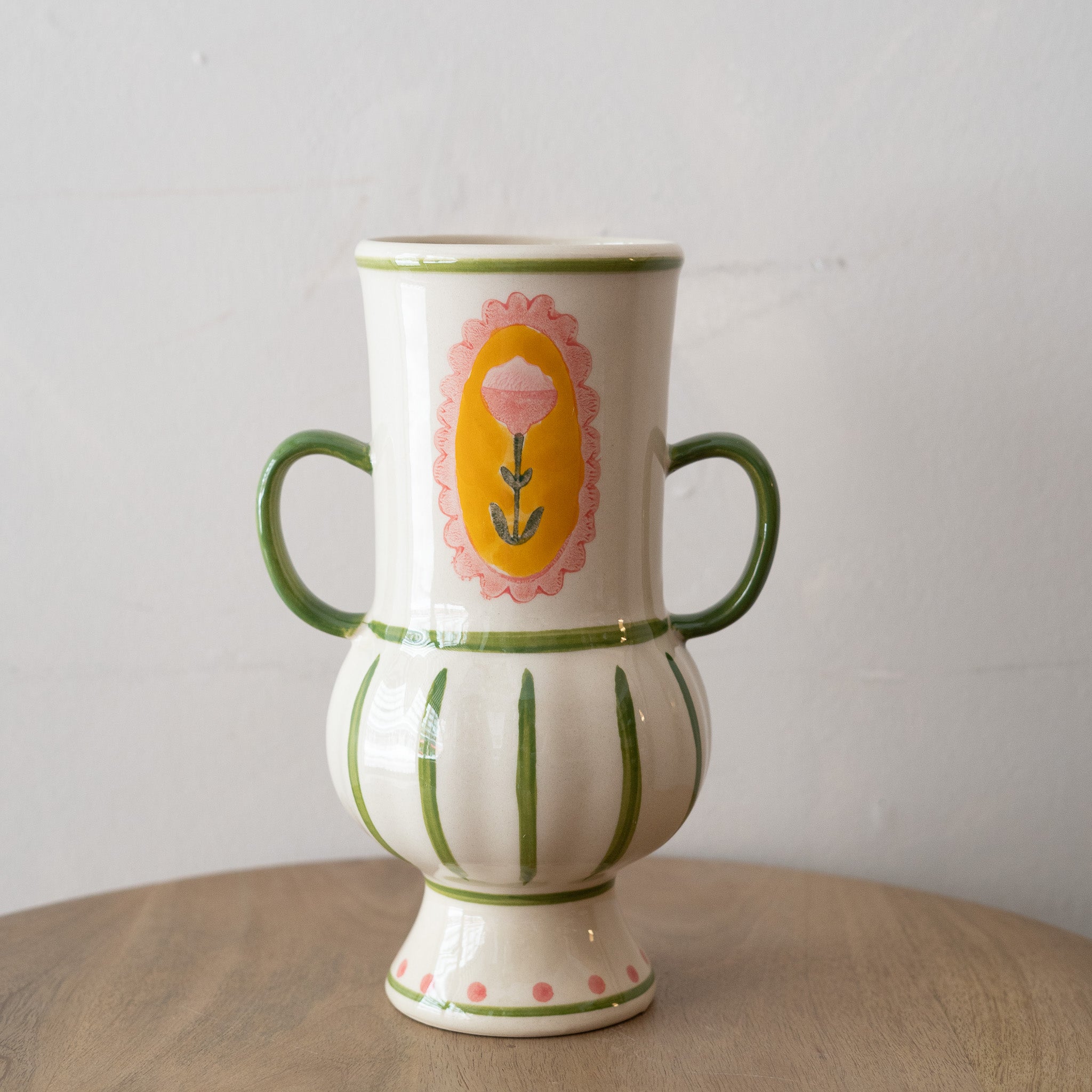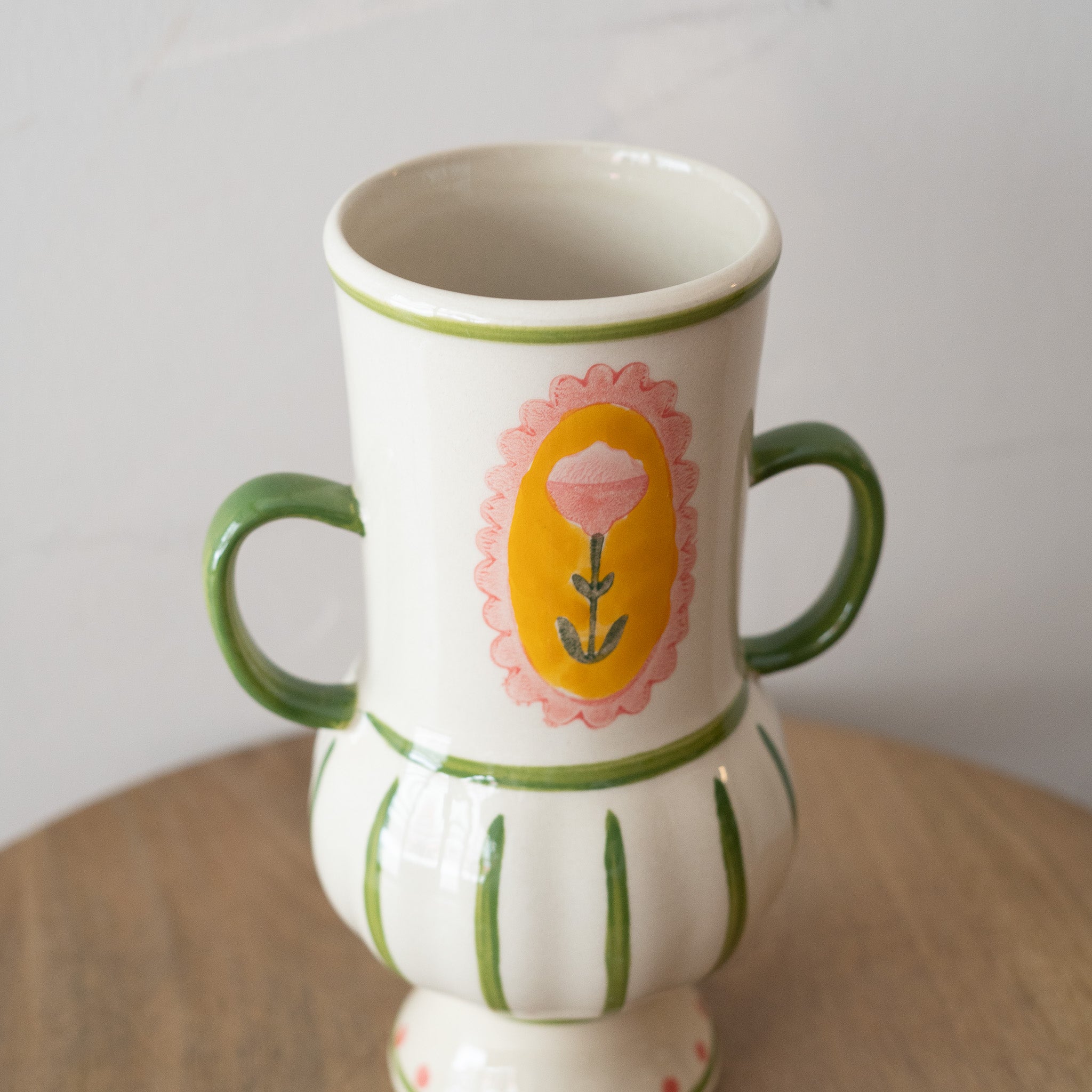 5-1/4"L x 4"W x 8"H Hand-Painted Stoneware Vase w/ Flower Image, Stripes & Handles