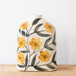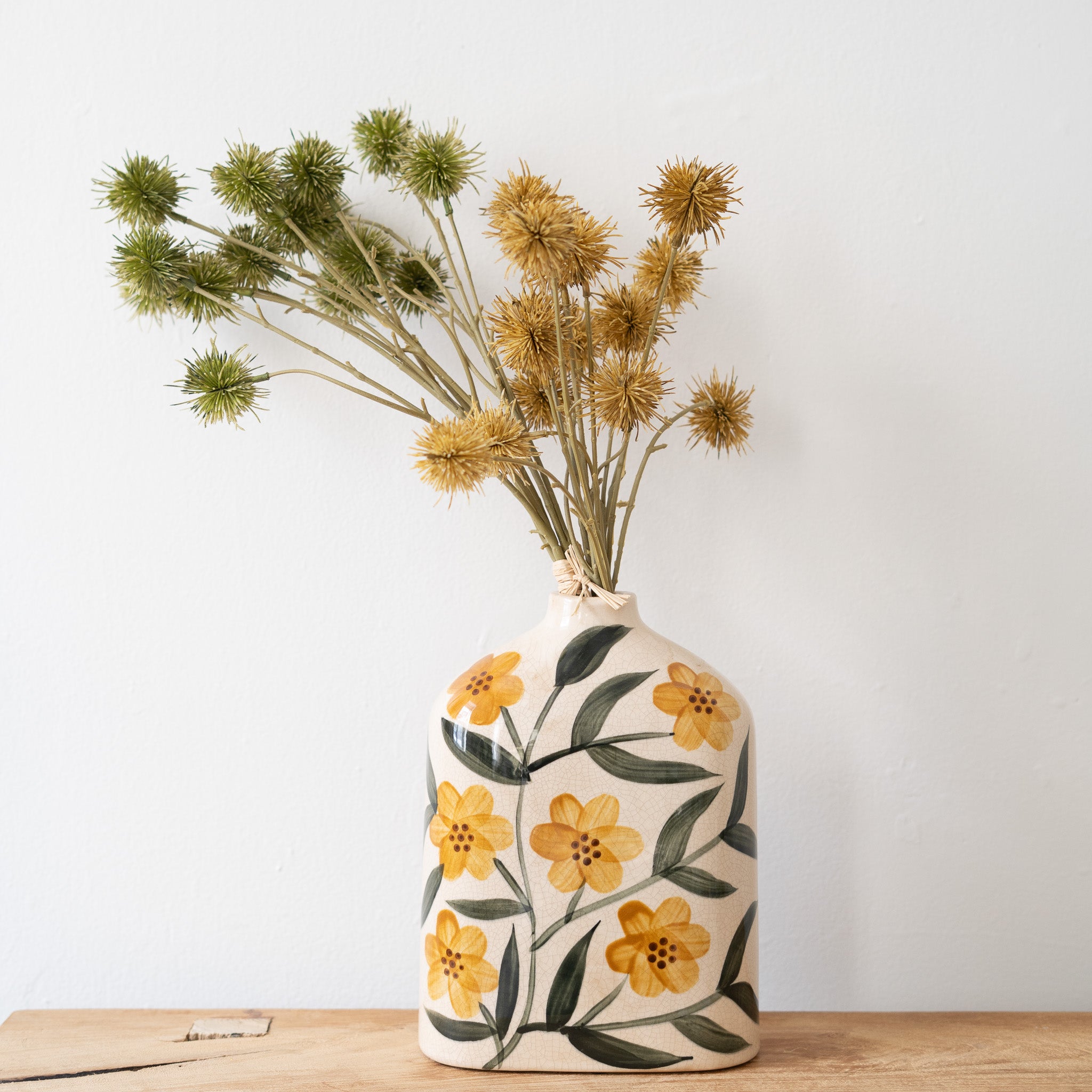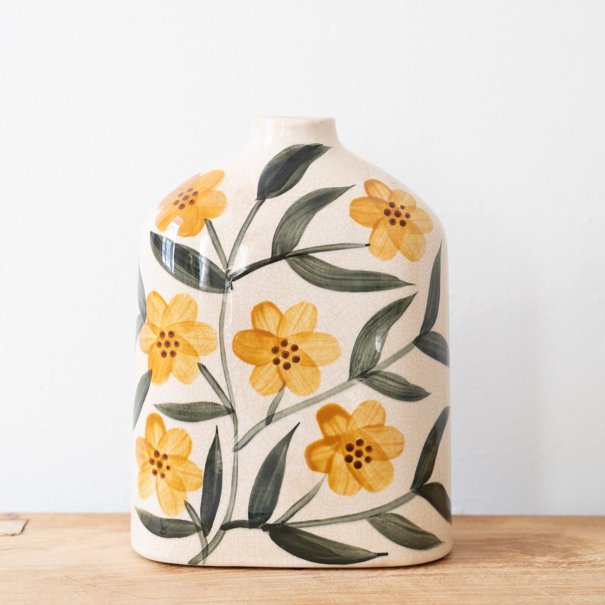 This medium flat vase is wide, weighty, and covered in floral flourishes. It’s ready to be admired, with or without flowers.