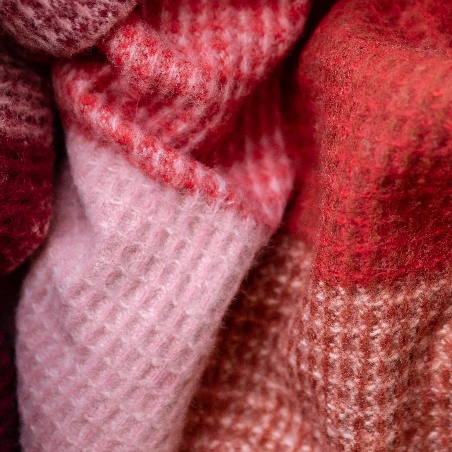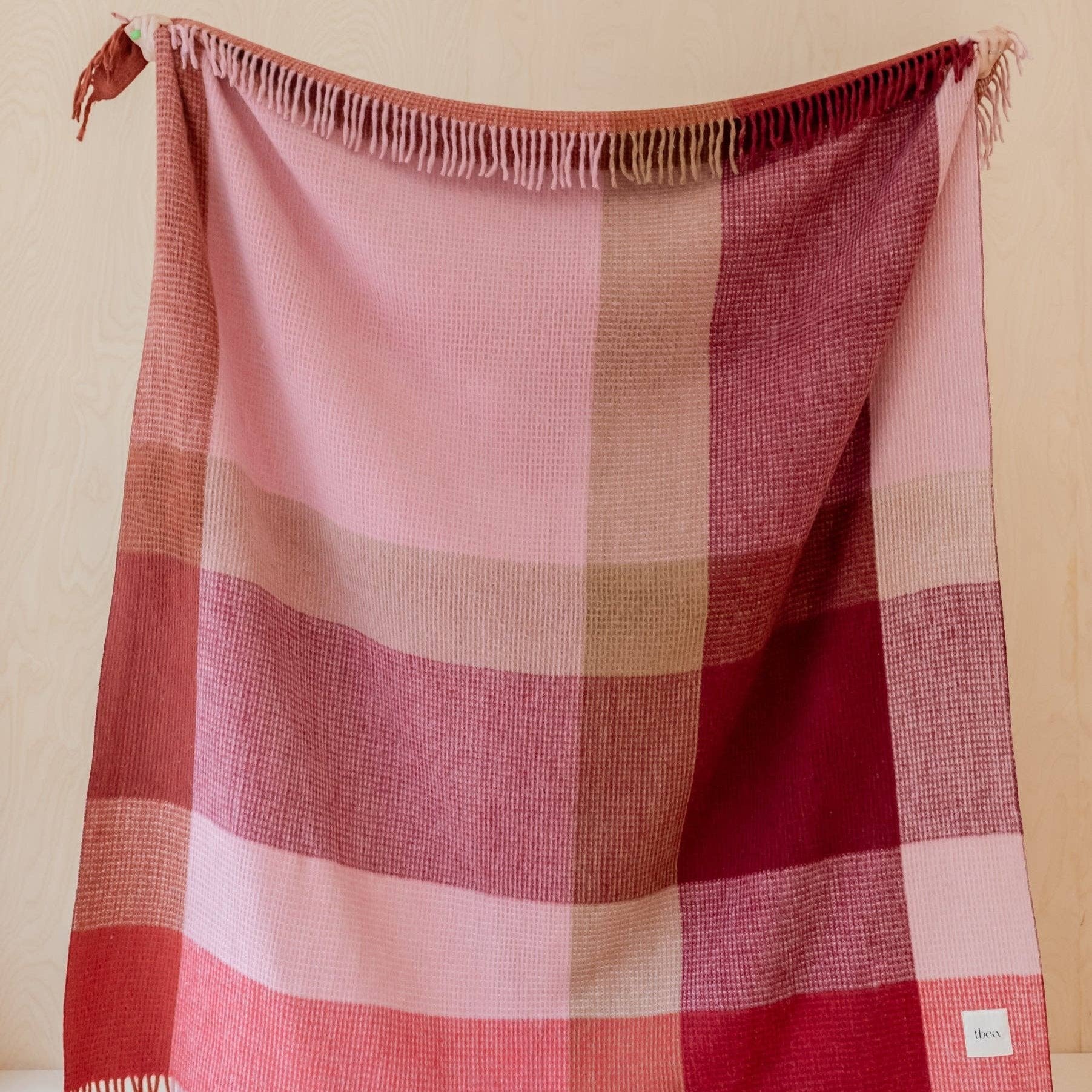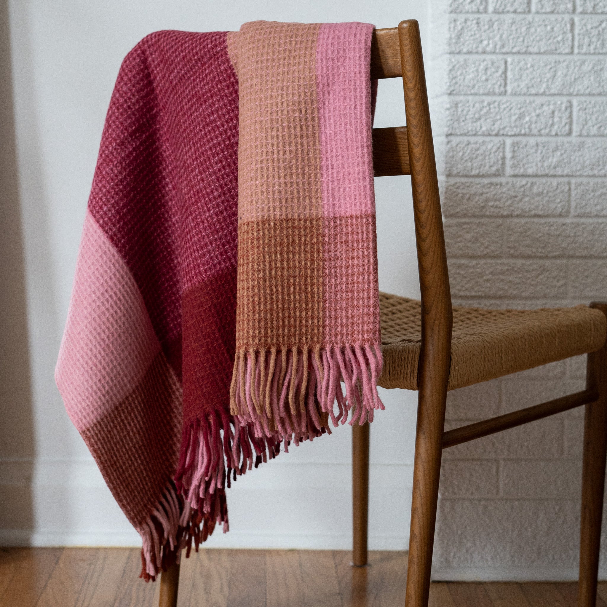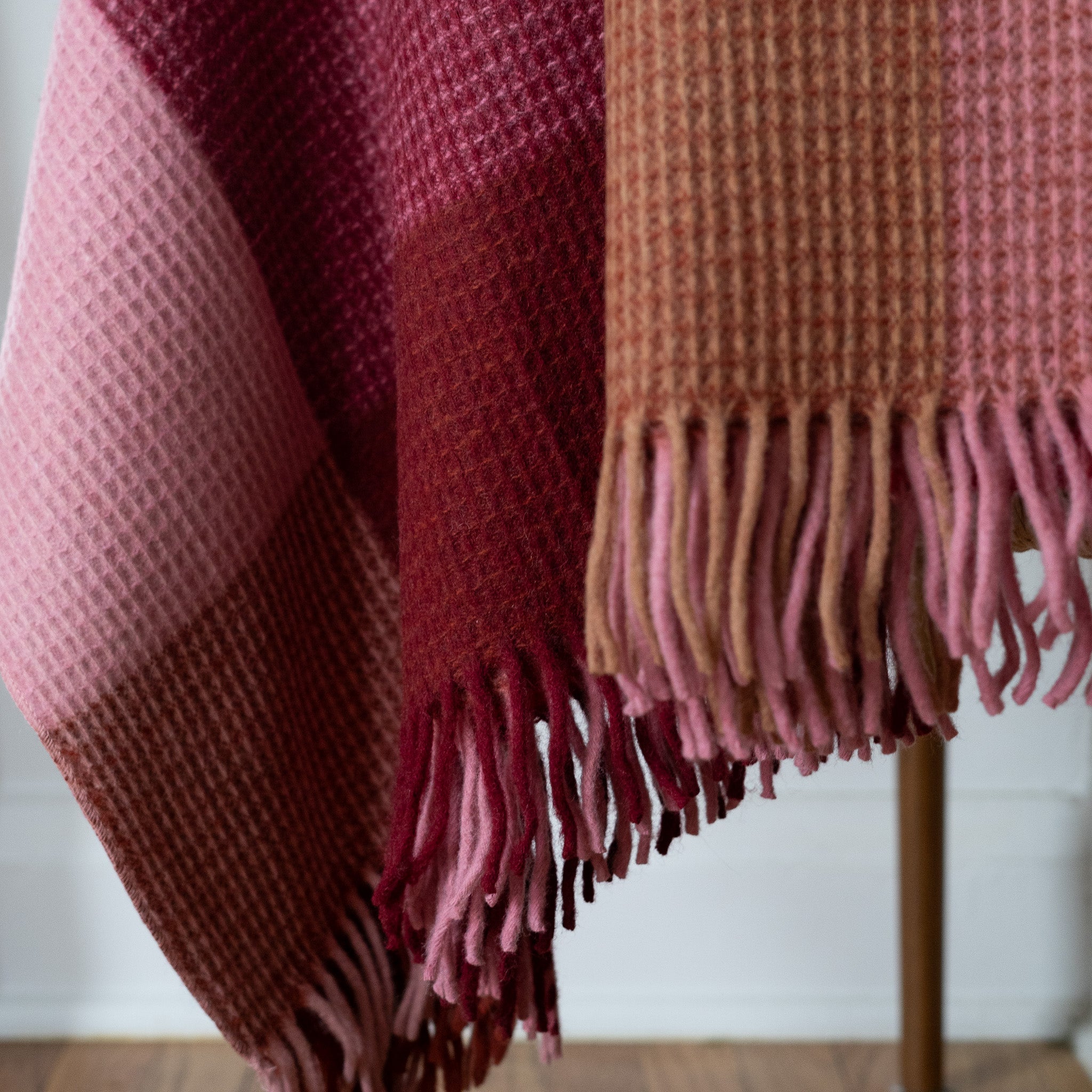 Stay warm and stylish with this Berry Waffle Block Check Recycled Wool Blanket. Made from sustainable materials that save six garments from landfill, this blanket is perfect for a comfortable and restful sleep. Plus, it's machine washable and versatile enough to use on your sofa, bed, or chair as a statement piece. Upgrade your home with ease using our high-impact, low-effort design philosophy.