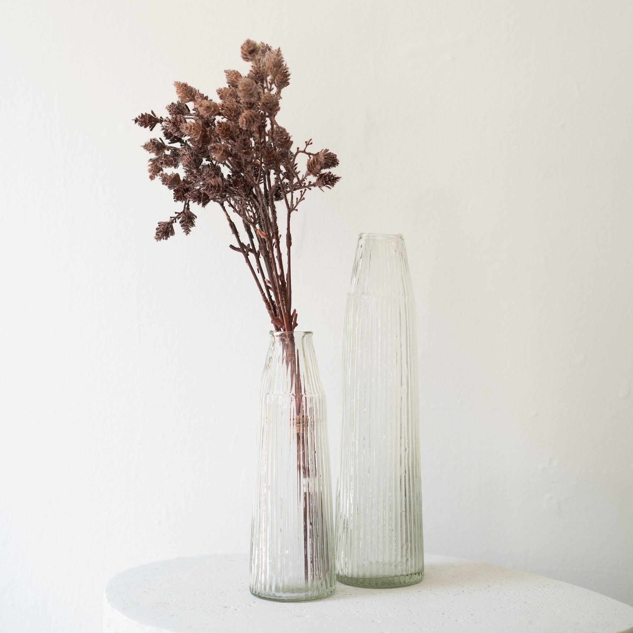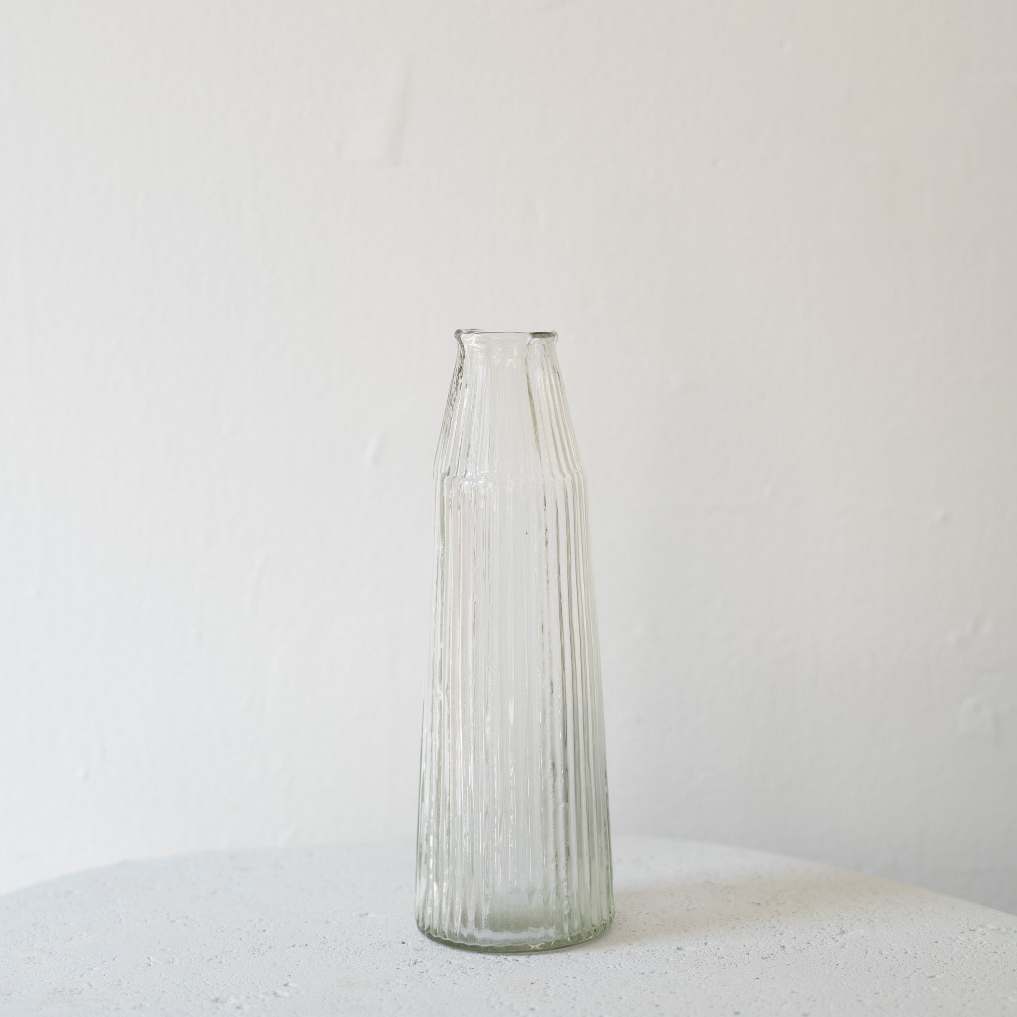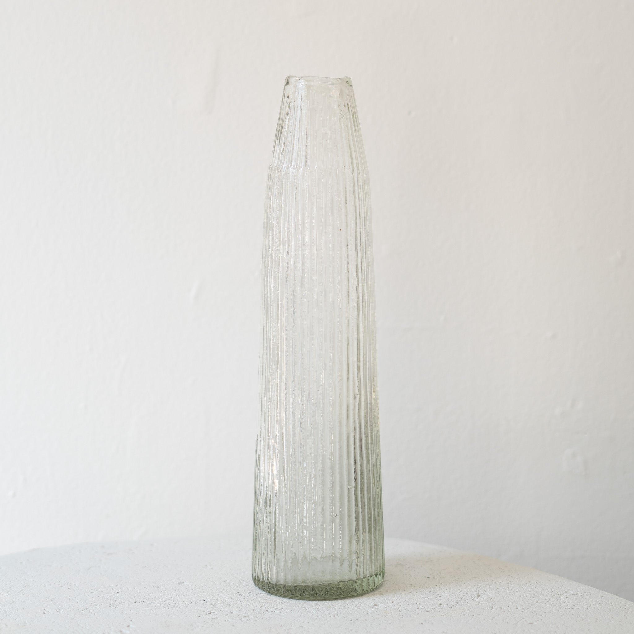 Introduce sophistication to your space with our Ribbed Glass Vase, handcrafted from recycled glass. The vertical ribbed pattern adds an elegant texture, capturing light beautifully. Each piece is uniquely shaped and designed due to the artisanal process. These vases effortlessly blend sustainability and style, adding a touch of understated luxury to any setting.