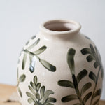 This stoneware vase features a rounded silhouette accented with raised frond detailing in a subtle yellow-green palette. Compact in size, it’s designed to complement natural interiors and elevate small floral arrangements or stand alone as a decorative piece.