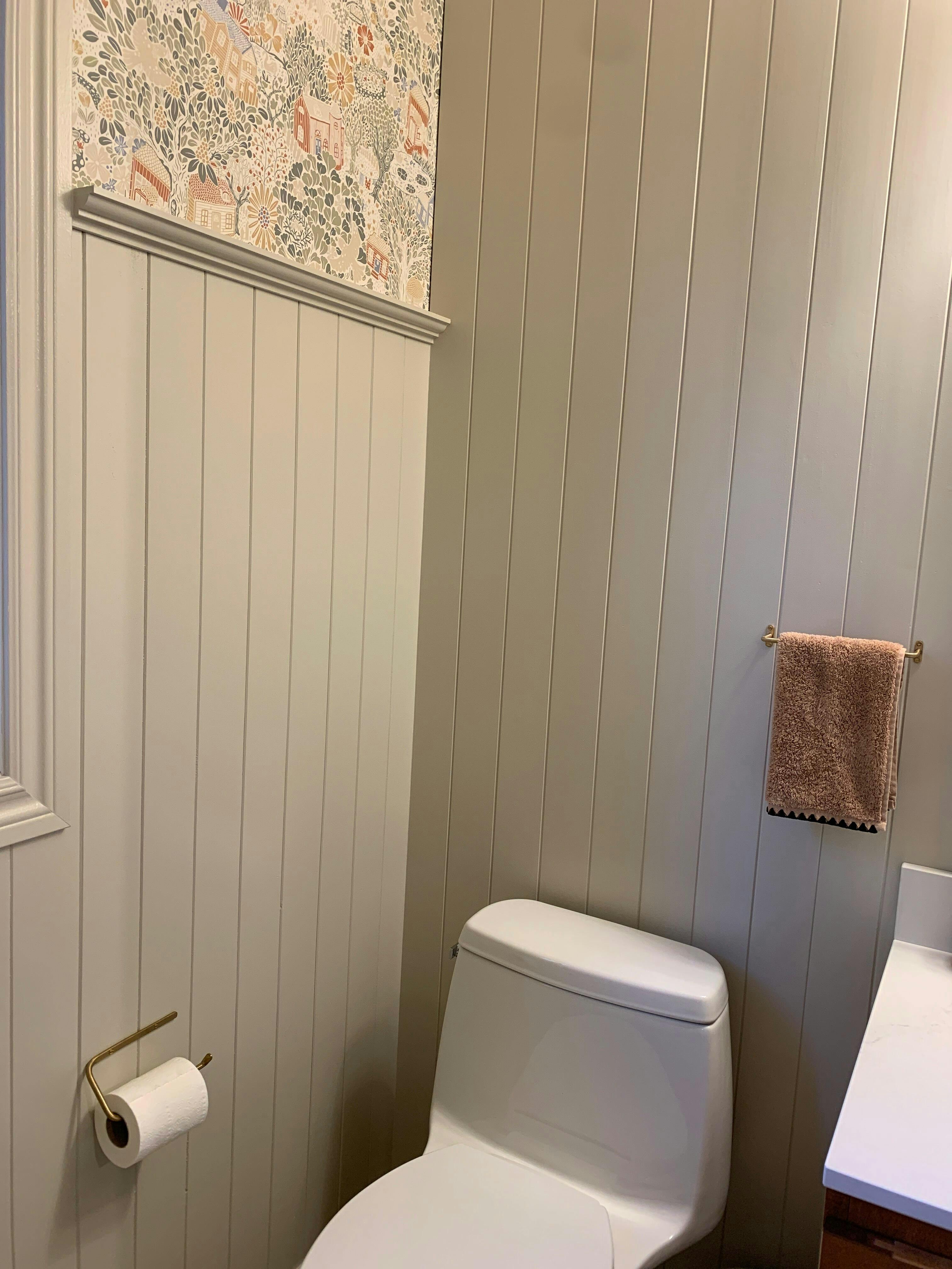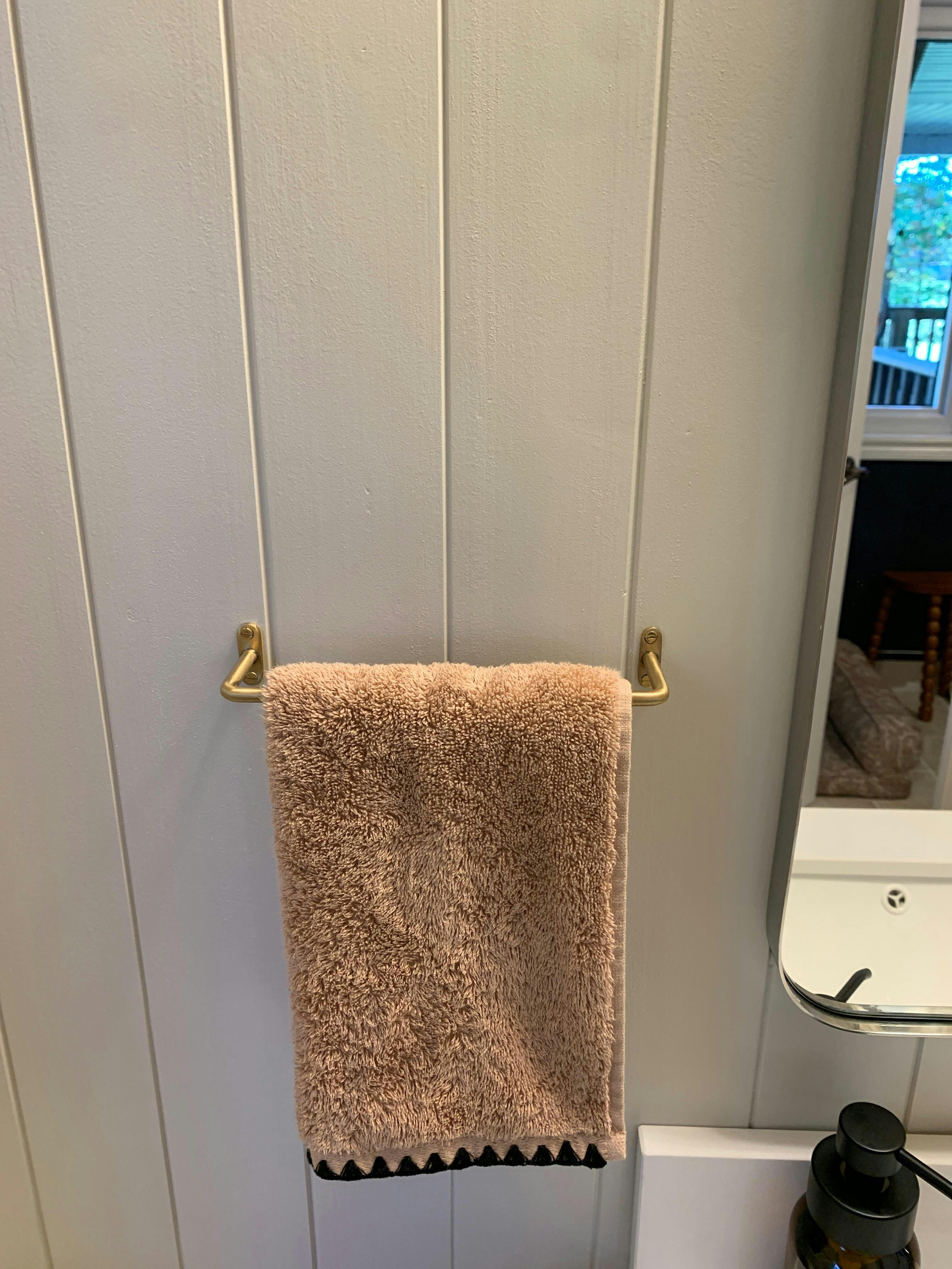 A simple towel bar. The natural brass or iron hue easily blends into the space, creating an antique-like ambiance.