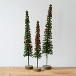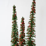 Set of 3 slim bristle trees green with red mini berries, wood base, 14+12+10 in.