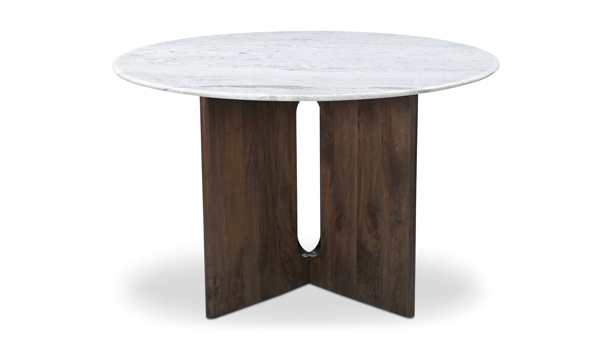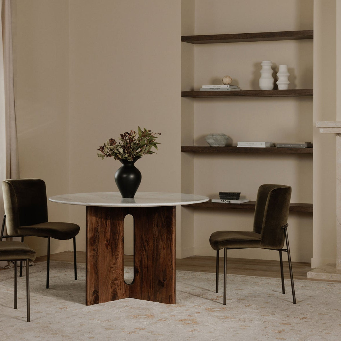 The Stanley dining table features a unique cross base with artfully carved arches at each end that lend an airy feel to its robust construction. Crowned with a solid marble top that showcases natural veining unique to each piece, it offers a durable, smooth surface ideal for daily dining and entertaining. The mango wood base grounds the piece, making it a versatile fit for diverse interior styles.