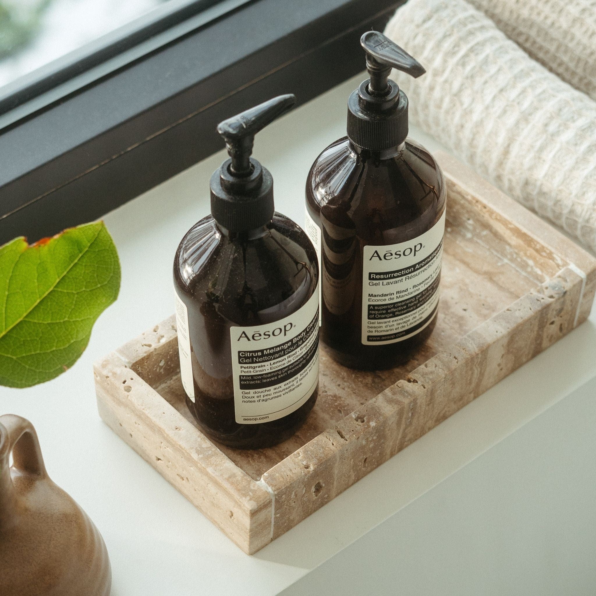Carved from solid stone, the Travertine Trays look at home in the bathroom, on the vanity, entryway, or bedside, and are great for organizing cosmetics, jewelry, perfume bottles or coffee table objects. Made from natural stone, they are praised for their irregular striations and colour variations, and each handcrafted tray will be one-of-a-kind.