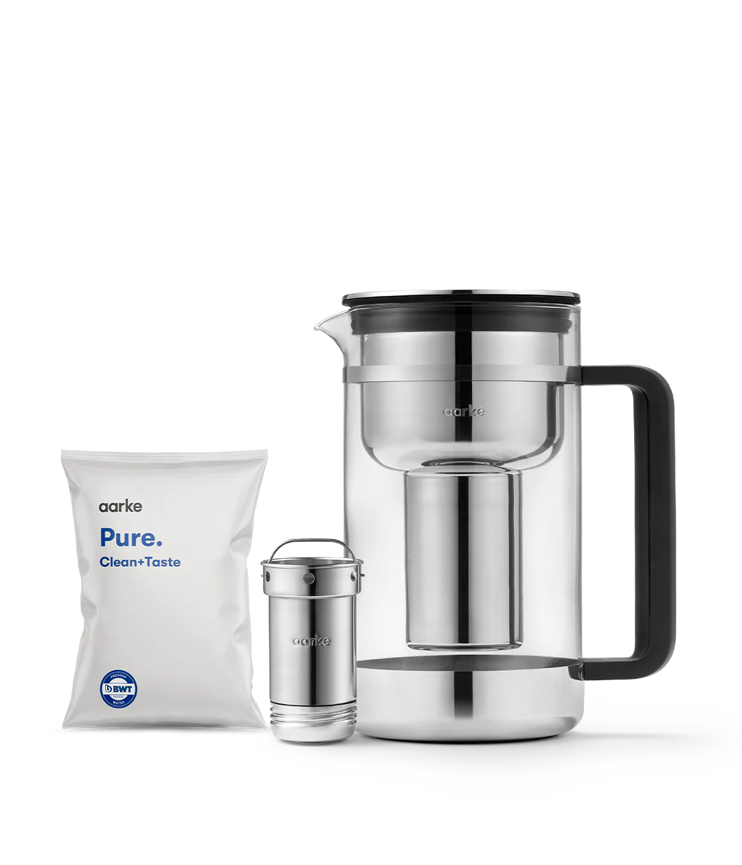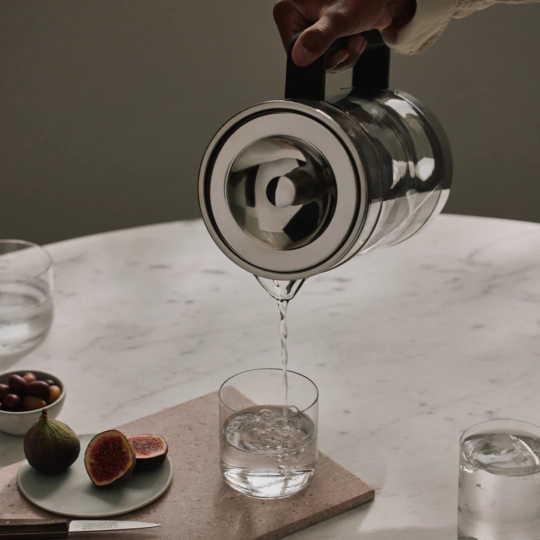 The Purifier Large is an award-winning timeless glass carafe water filter jug with no plastic cartridges. Instead: a refillable stainless-steel cartridge with filter granules inside. Purifier Large features the same filter technology as the original Purifier, and holds a larger volume of almost 1.7 L (57.47 fl oz.) of filtered water.