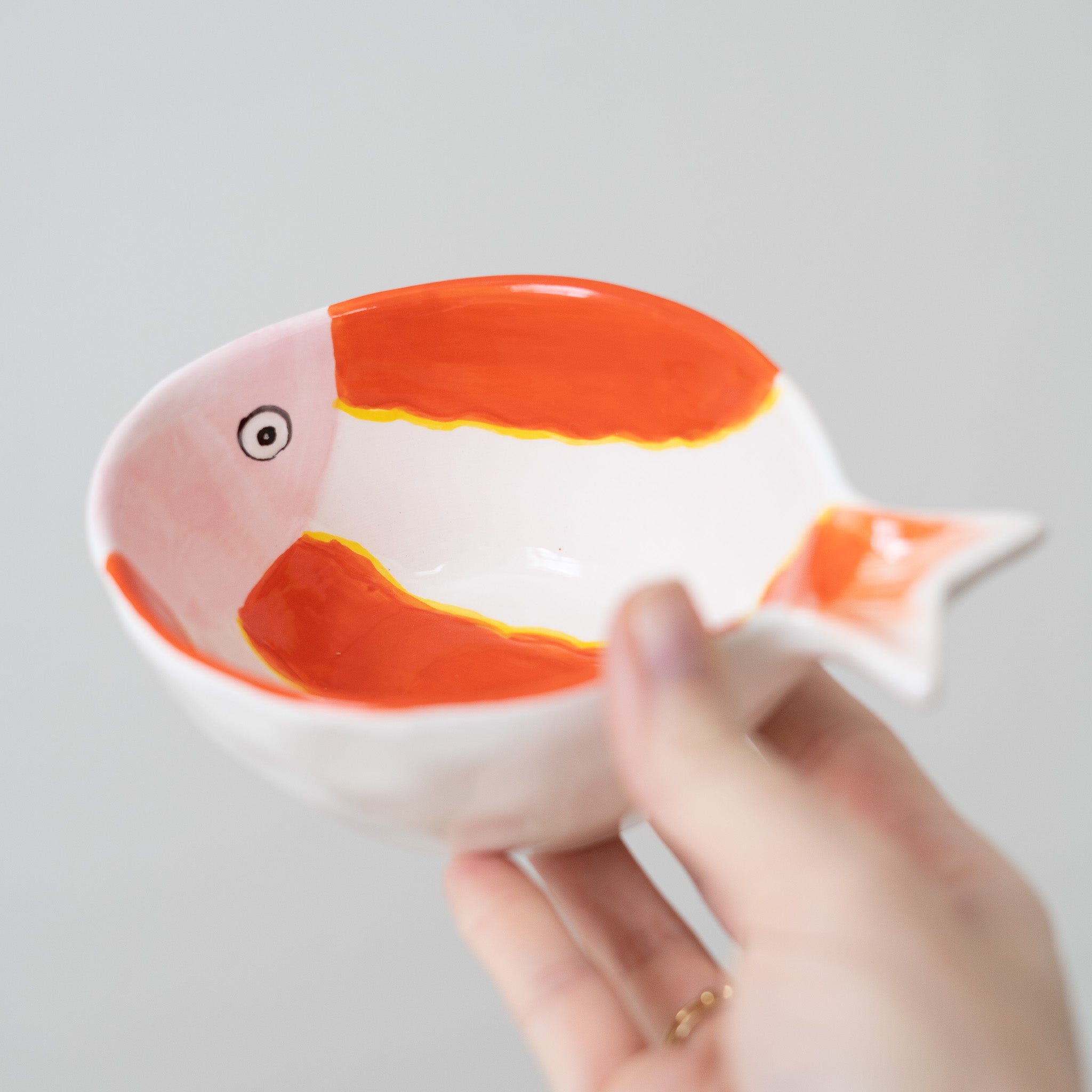This medium fish-shaped ceramic bowl brings an unexpected pop of color to the table. Its curved form and painterly stripes make it ideal for snacks, fruit, or decor.