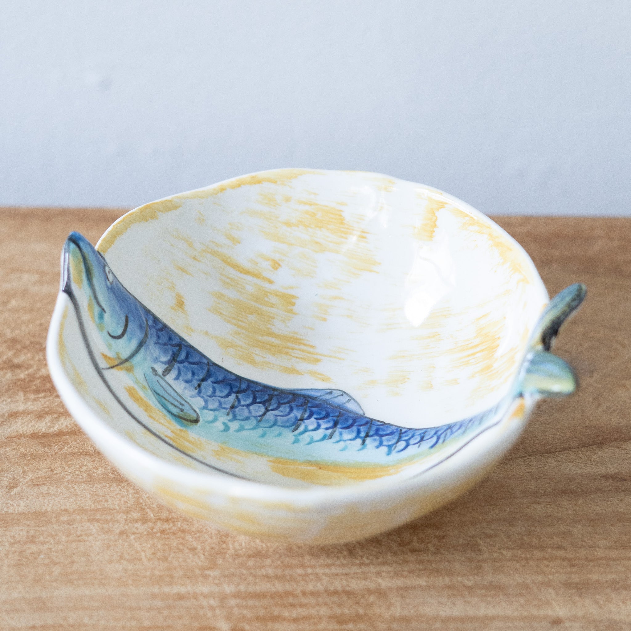 Inspired by coastal Portugal, this small round bowl features a sleek fish motif in blue and yellow. Great for olives, dips, or catching keys by the door.