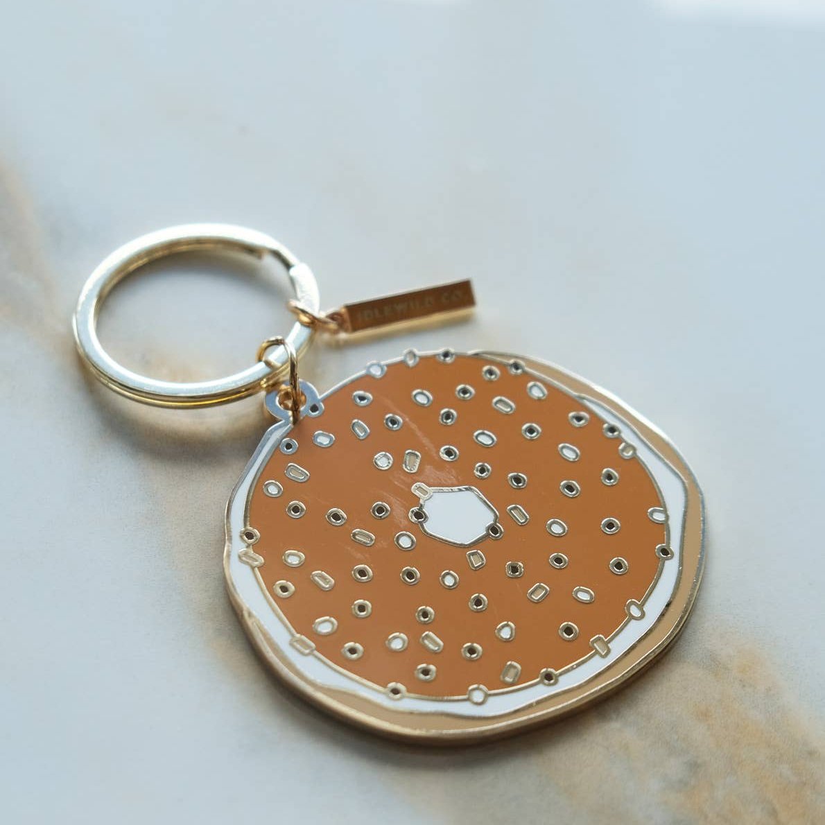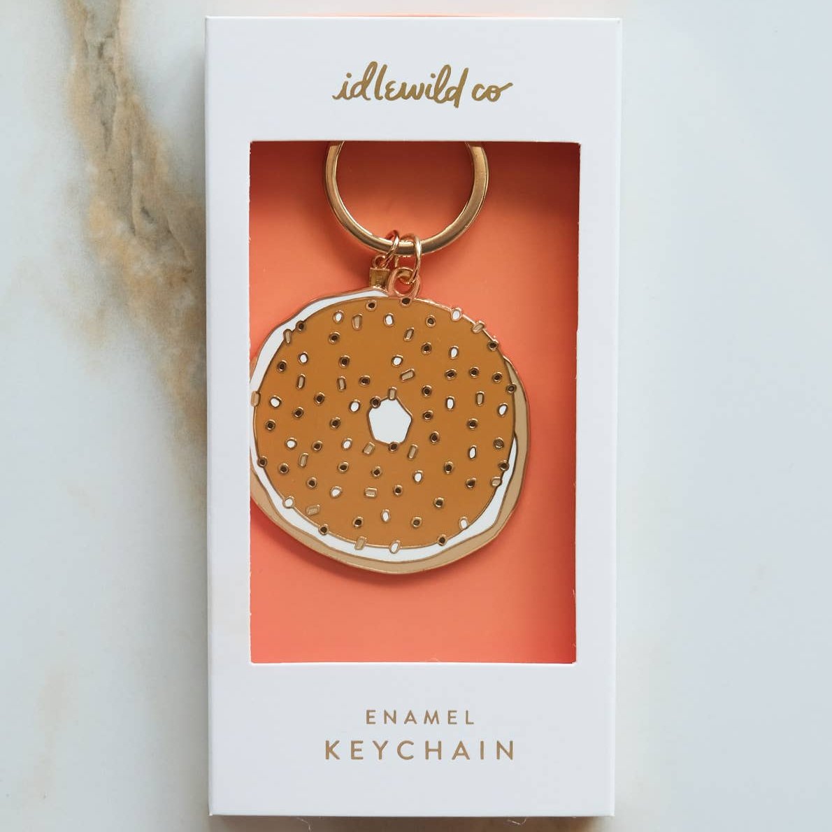 Add some playful charm to your keyring with our Bagel Keychain! Featuring a vibrant, hard-enamel design and polished brass, this eye-catching accessory will ensure you never lose your keys in your bag again (although we can't promise the same for your bagels). Measures approximately 2.25" x 2.25".
