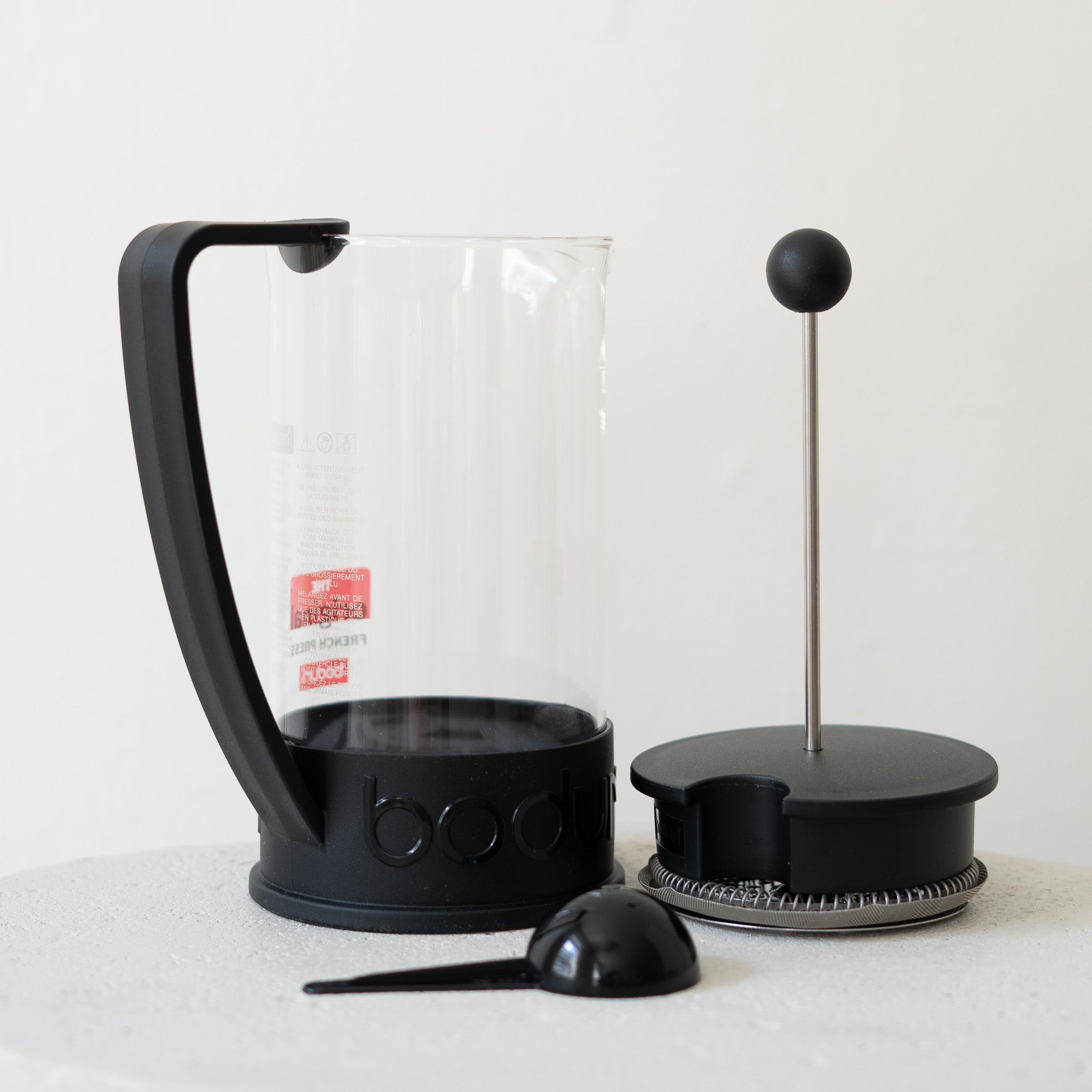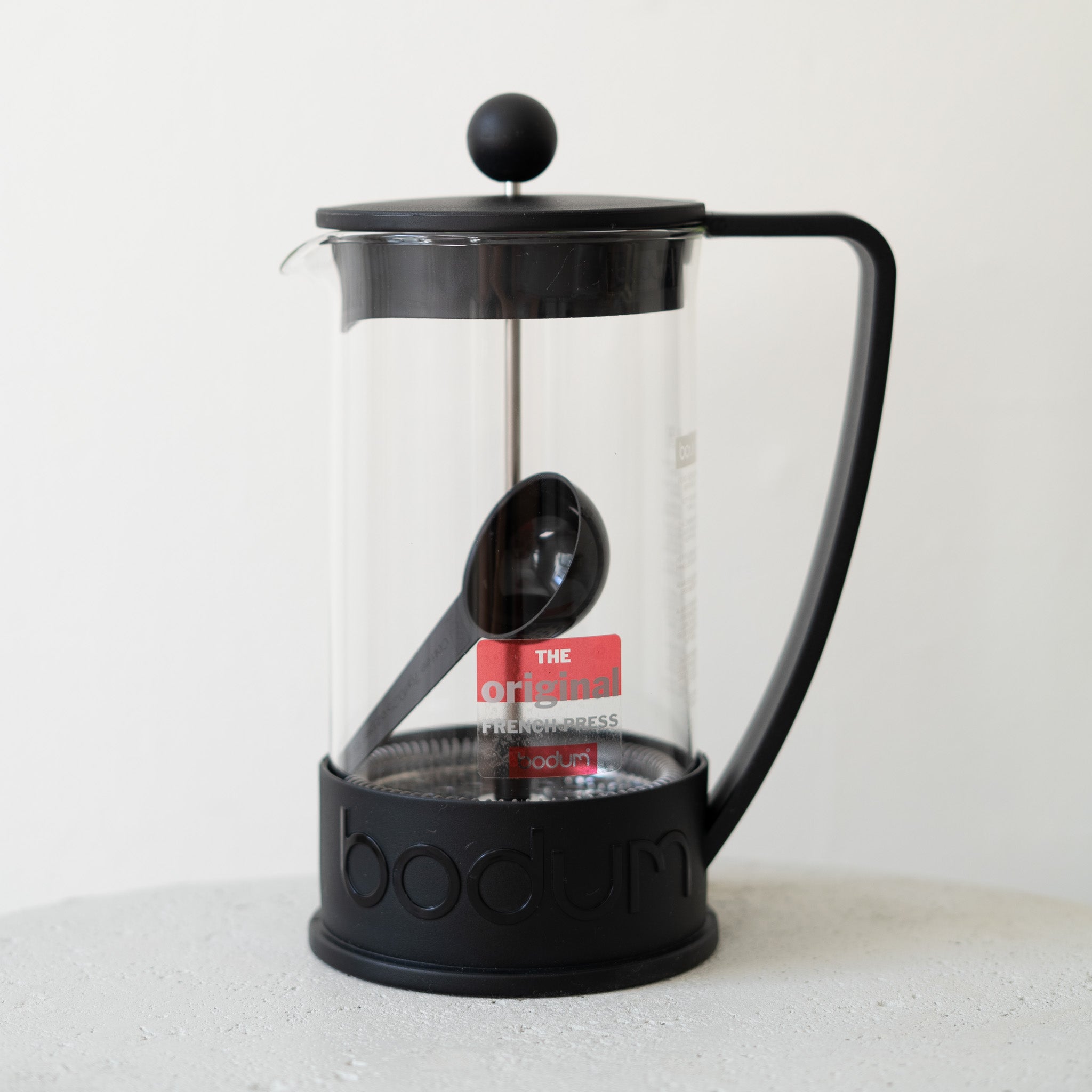 - Add one rounded teaspoon or one Bodum scoop of coarsely ground coffee for each cup/4oz water.