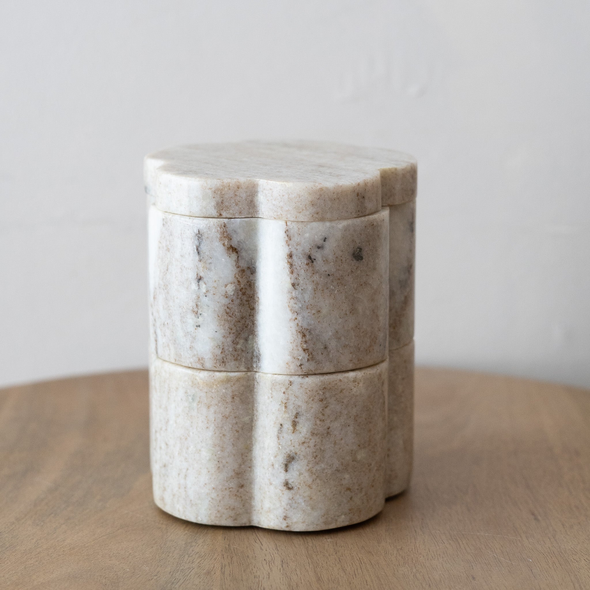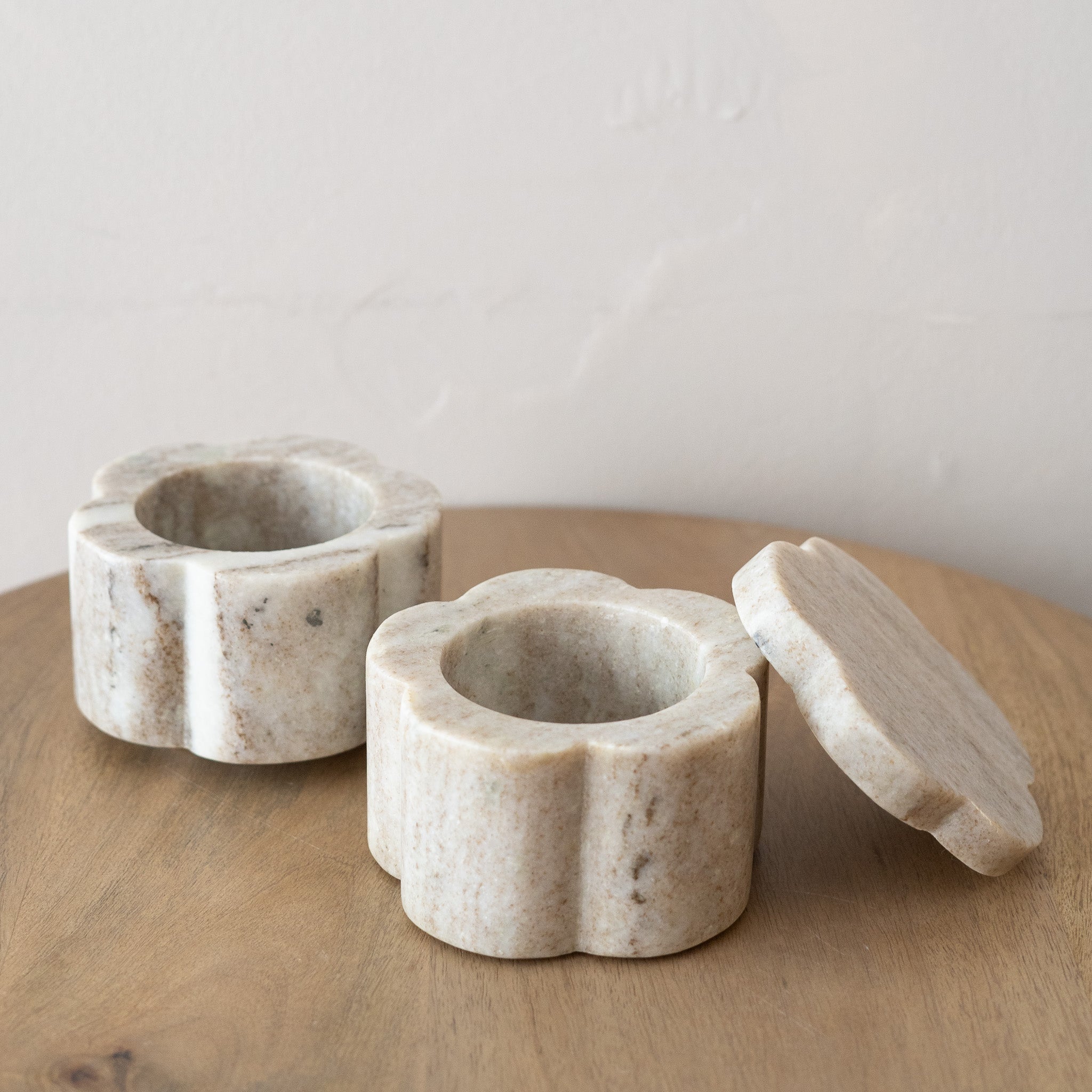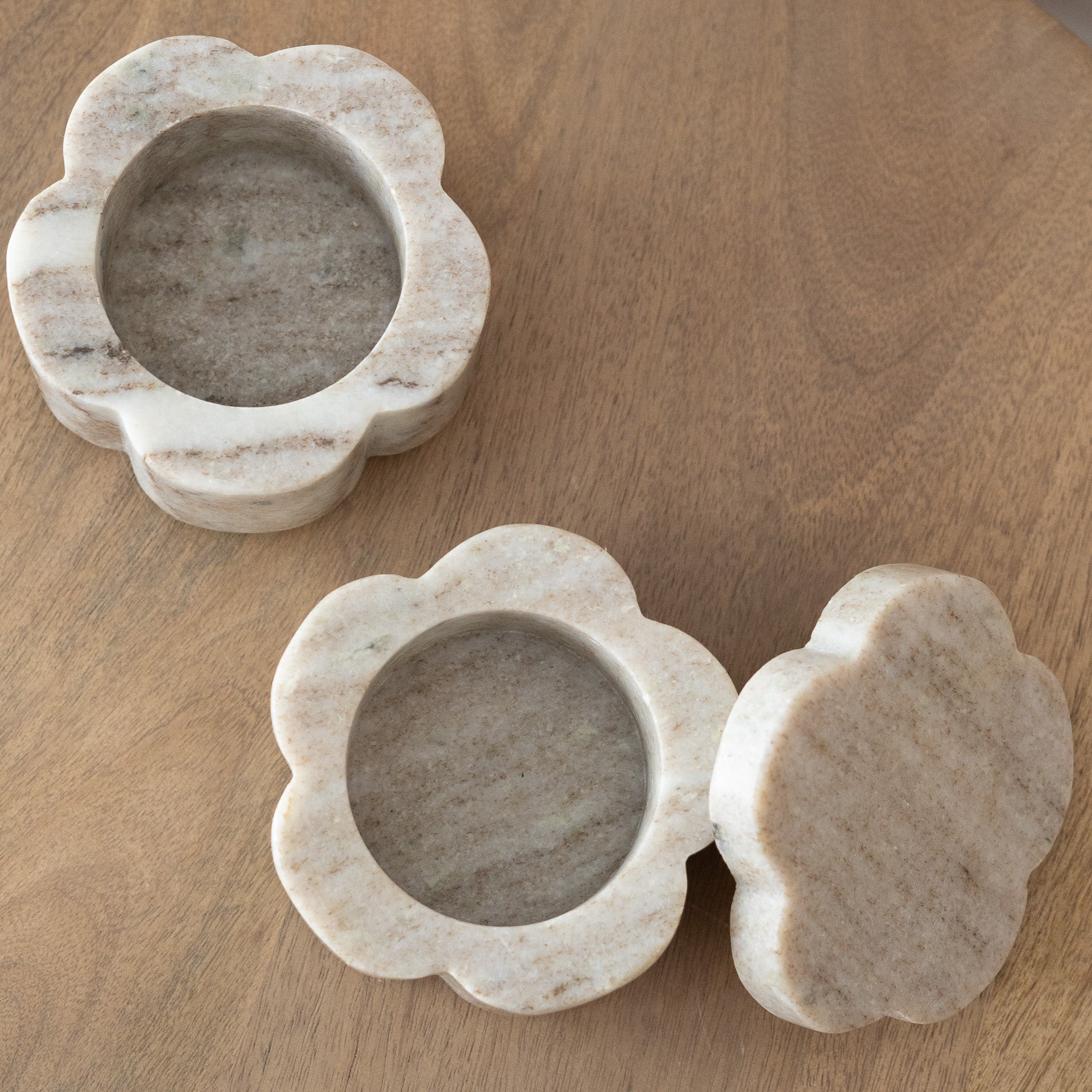 3-1/2"L x 3-1/2"W x 4-1/2"H Marble Scalloped Stackable Pinch Pots w/ Lid, Buff Color, Set of 2