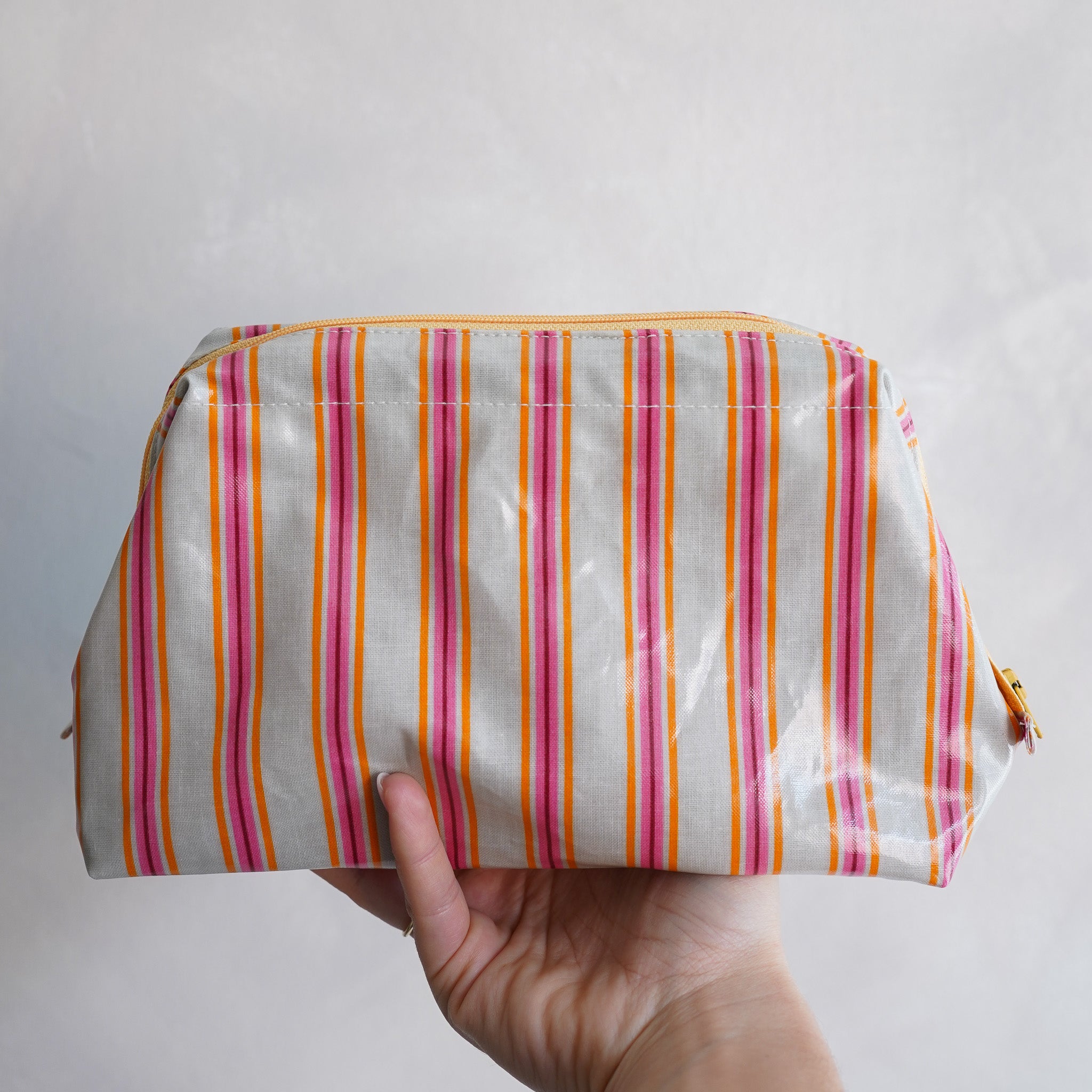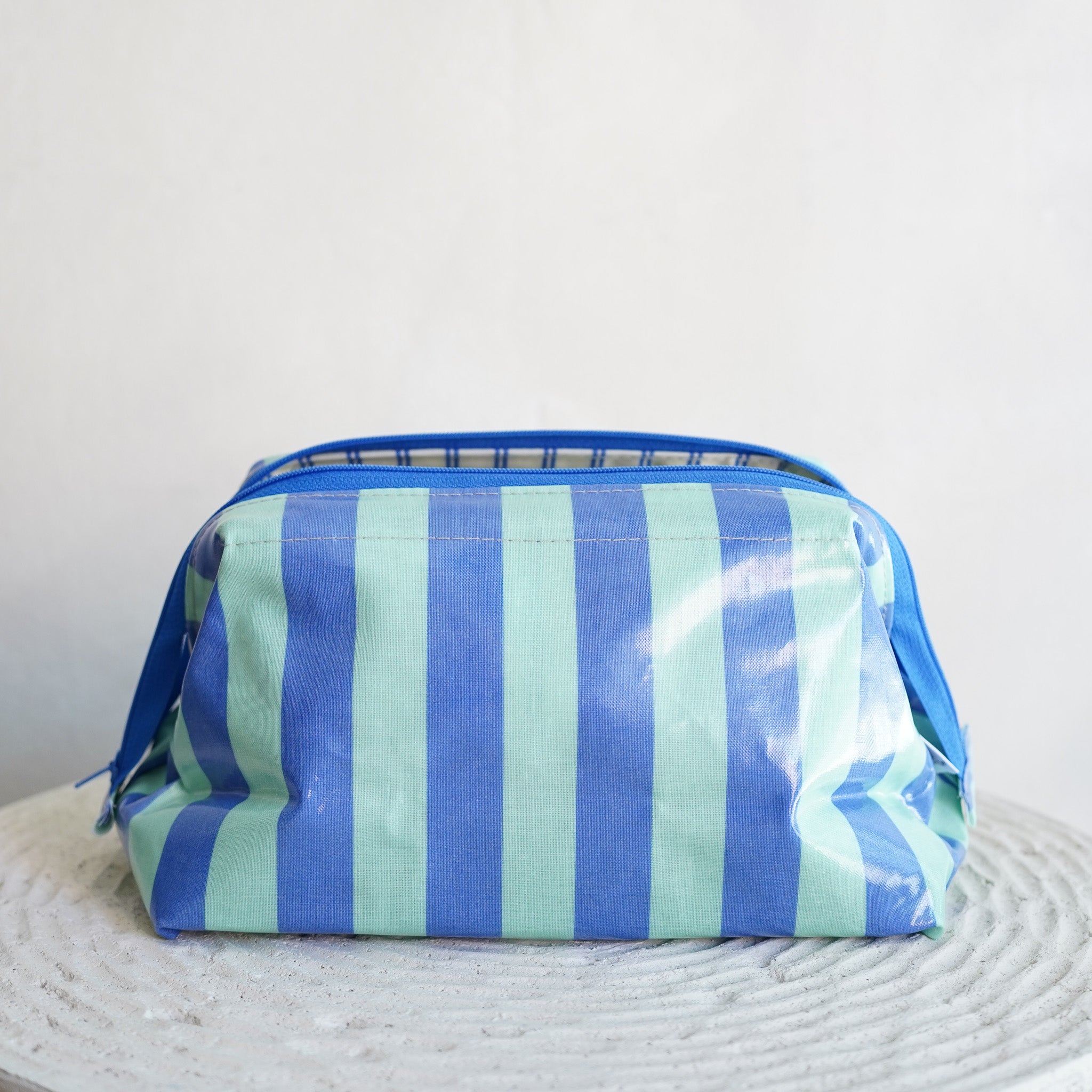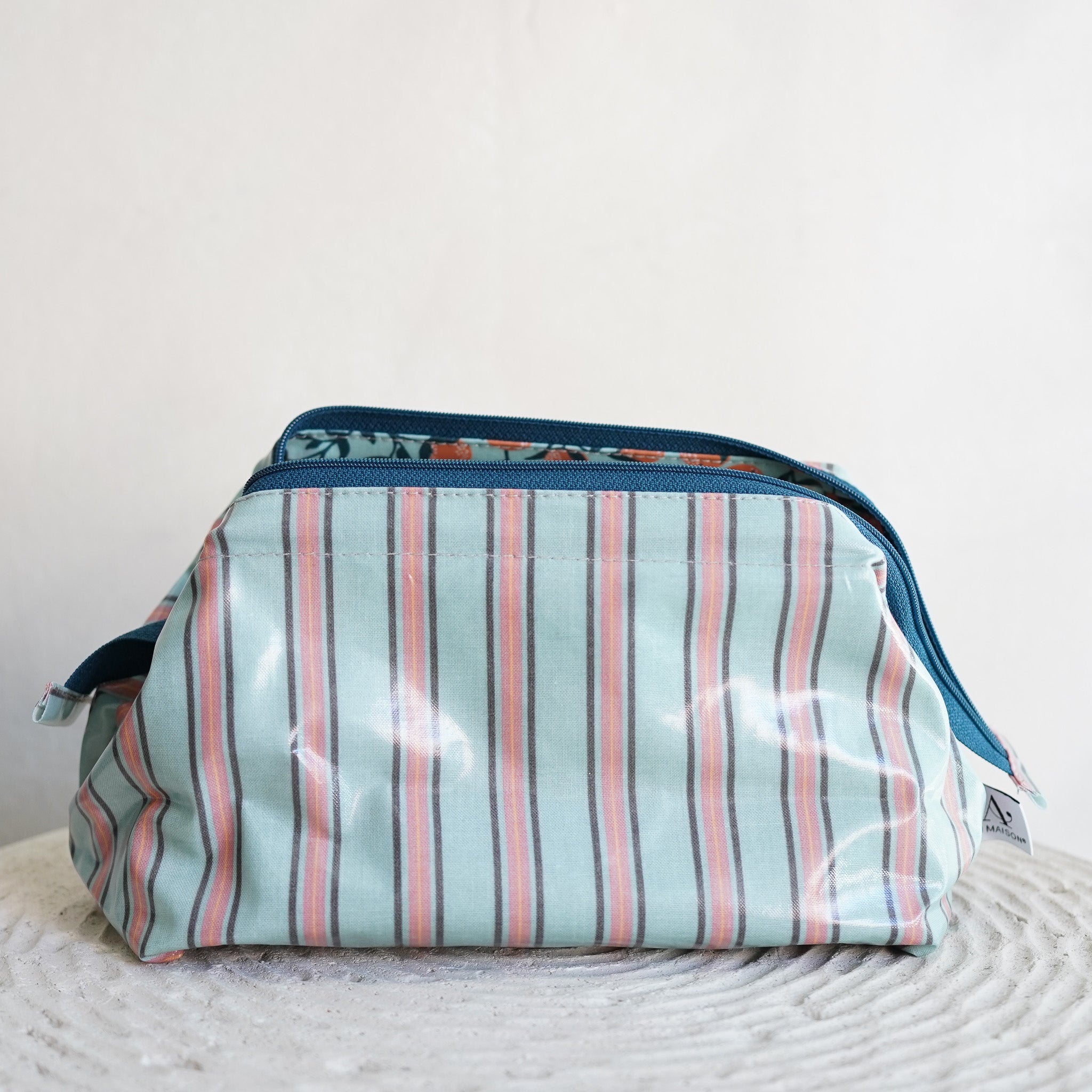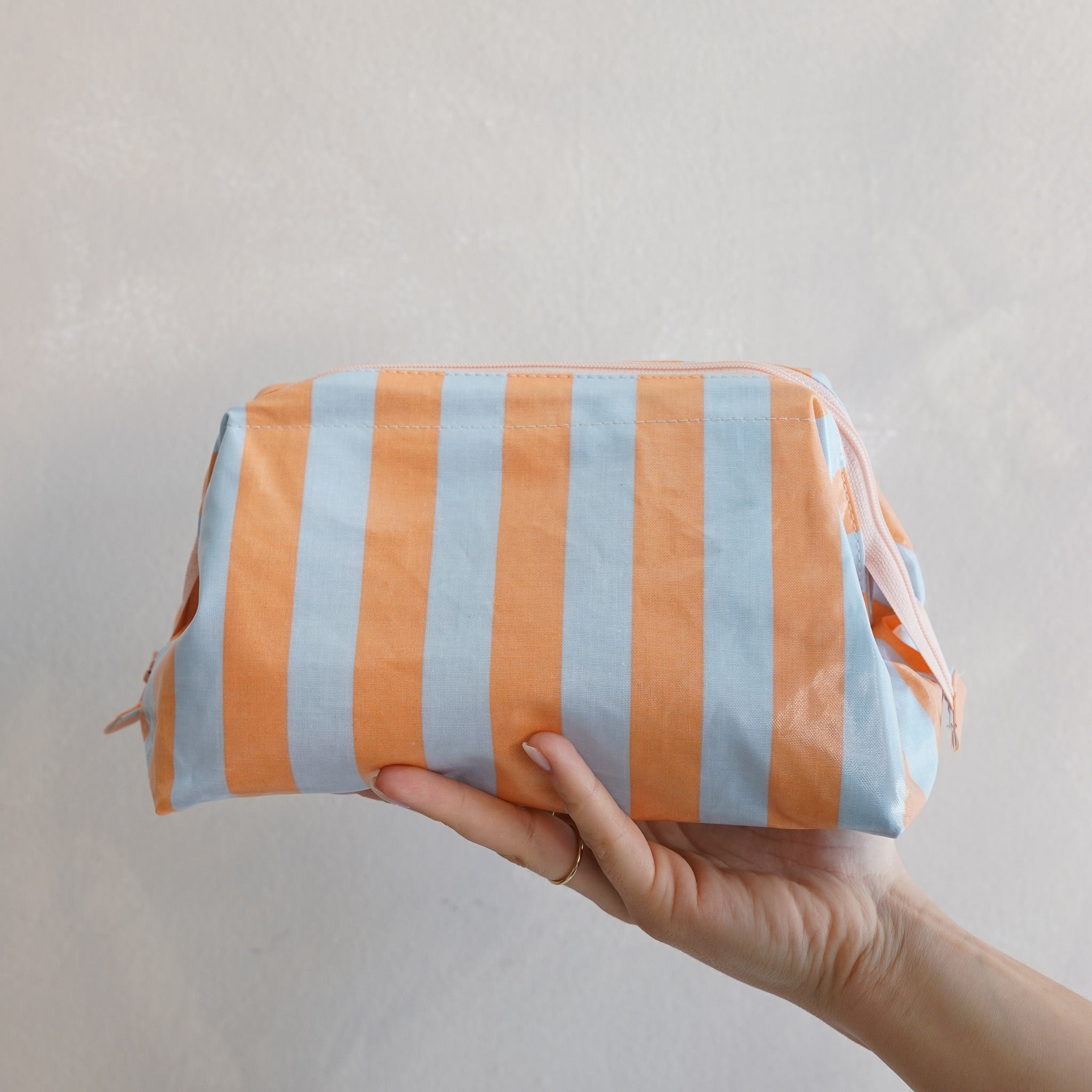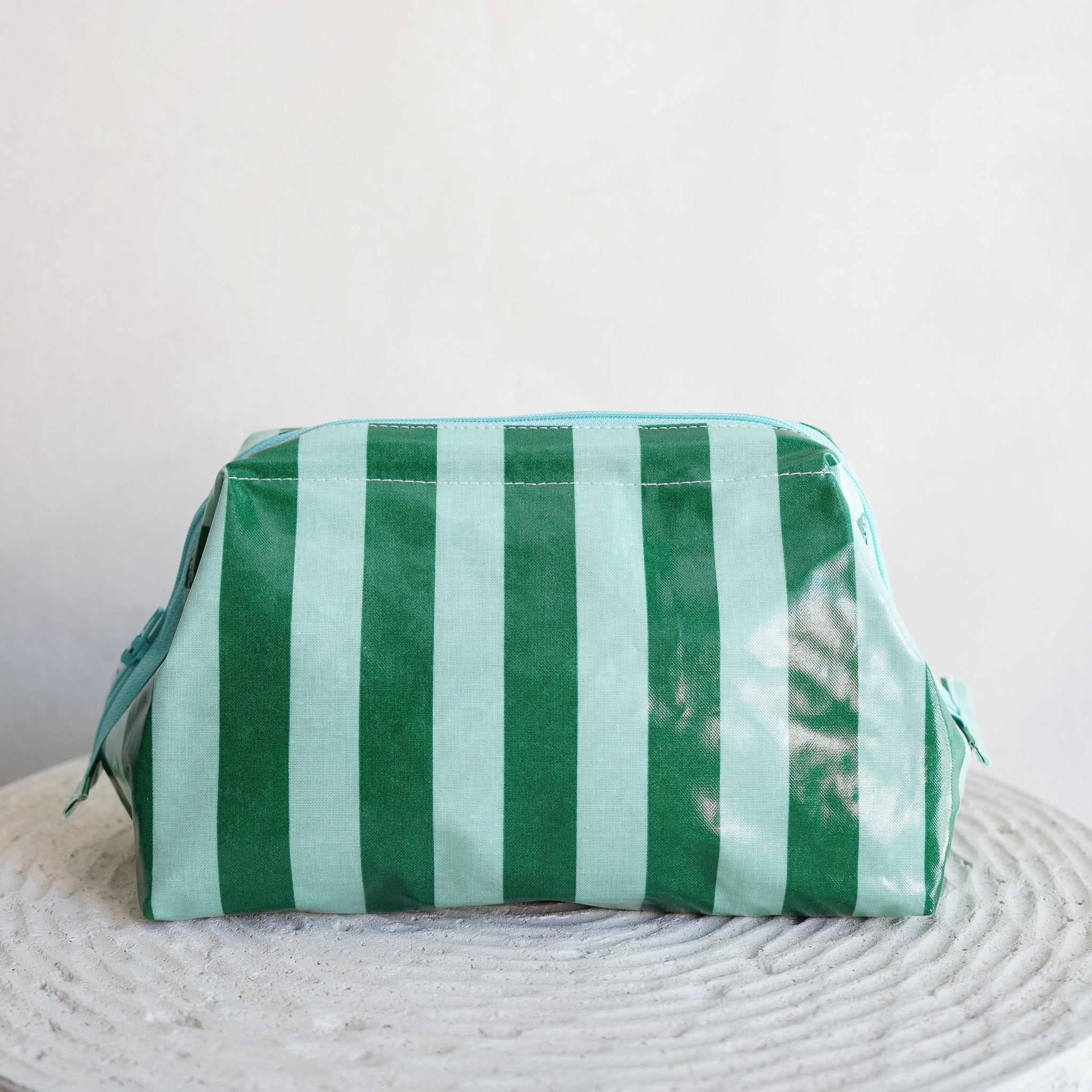Travel with ease and organization with our Striped Toiletry Bag. Its waterproof design allows for easy cleaning, while its spacious opening makes it effortless to locate your essentials. Stay prepared on-the-go with this practical and generously sized pouch.