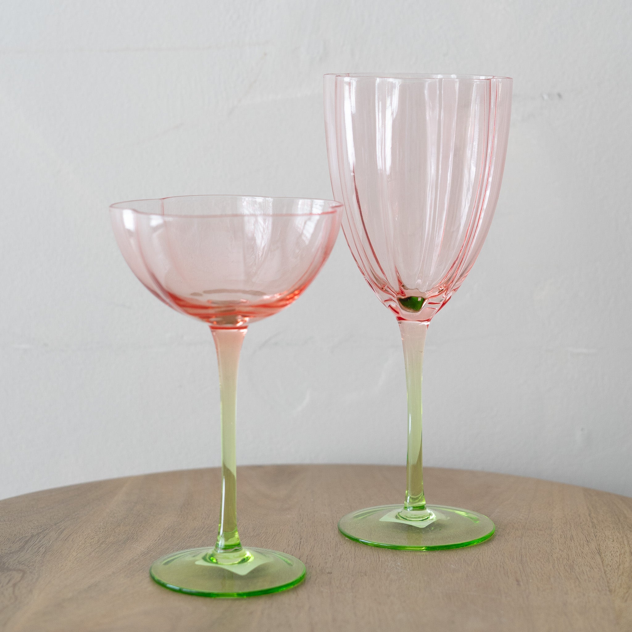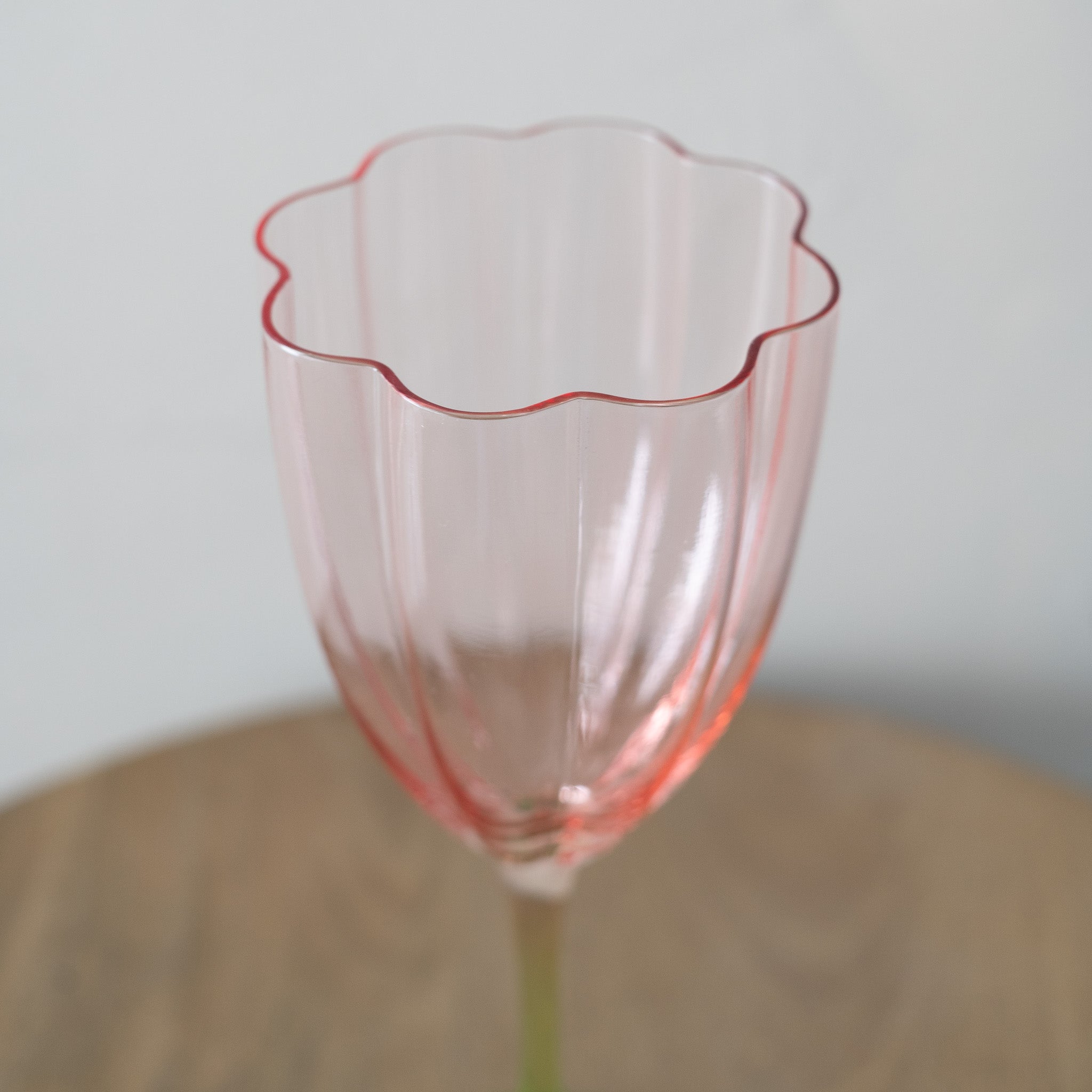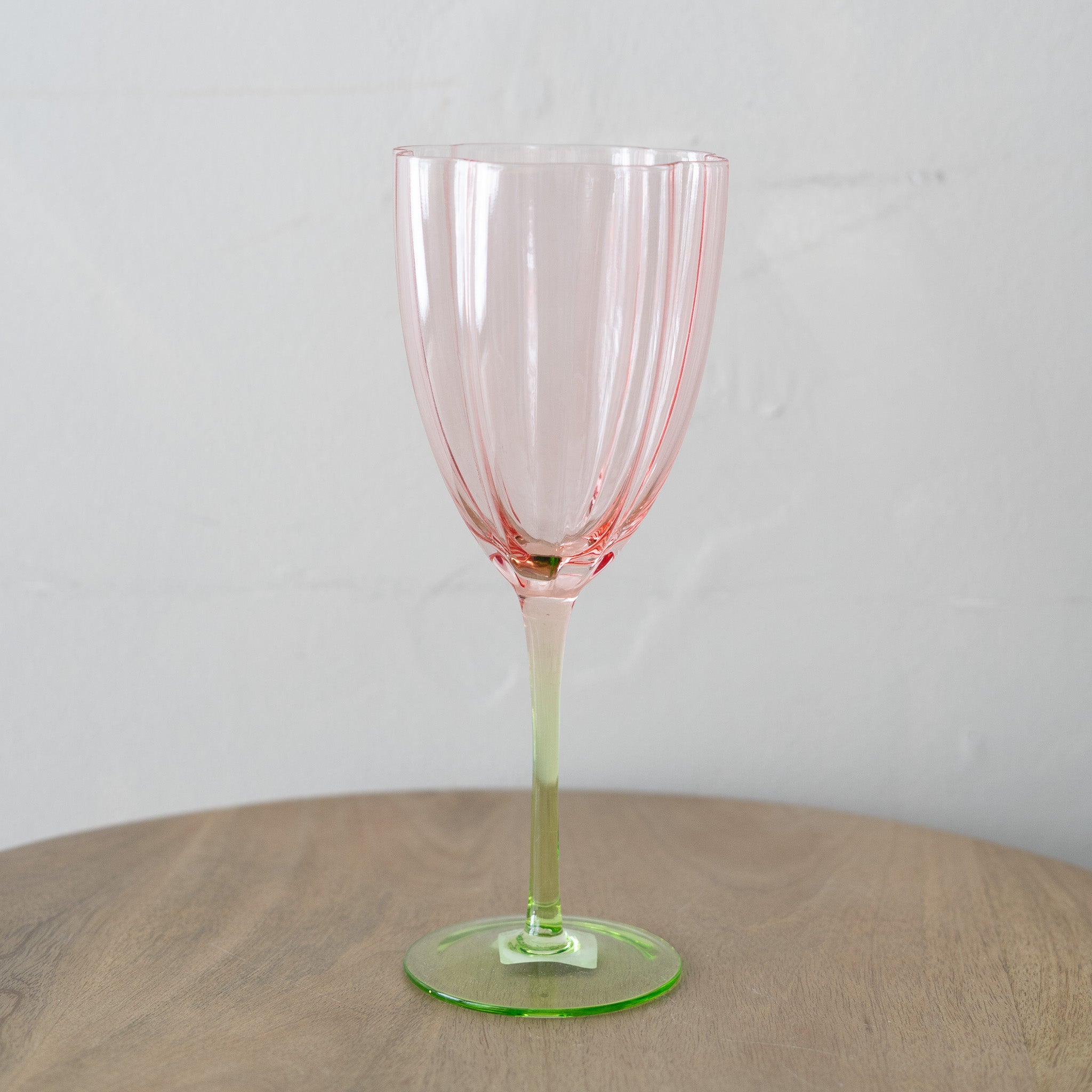 Spruce up your festivities with our Flower Look Wine Glass - a tasteful addition to any gathering. The soft pink color and green base will charm your guests and elevate the atmosphere. Can also be found as a flute or coupe glass. Handwash.