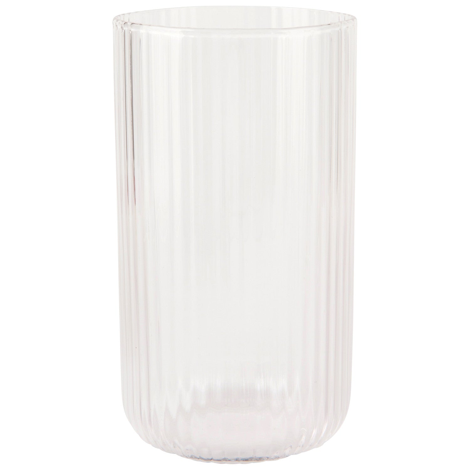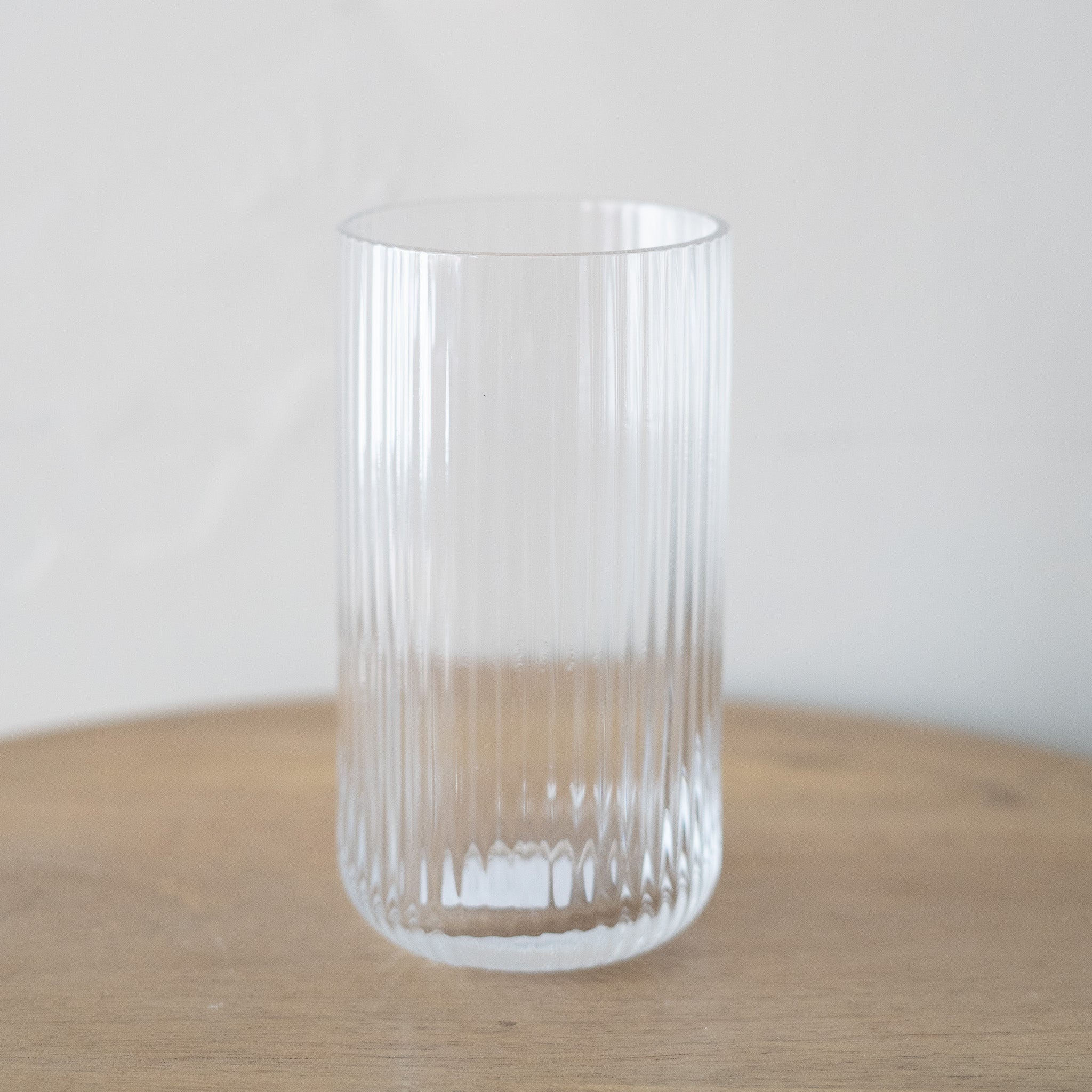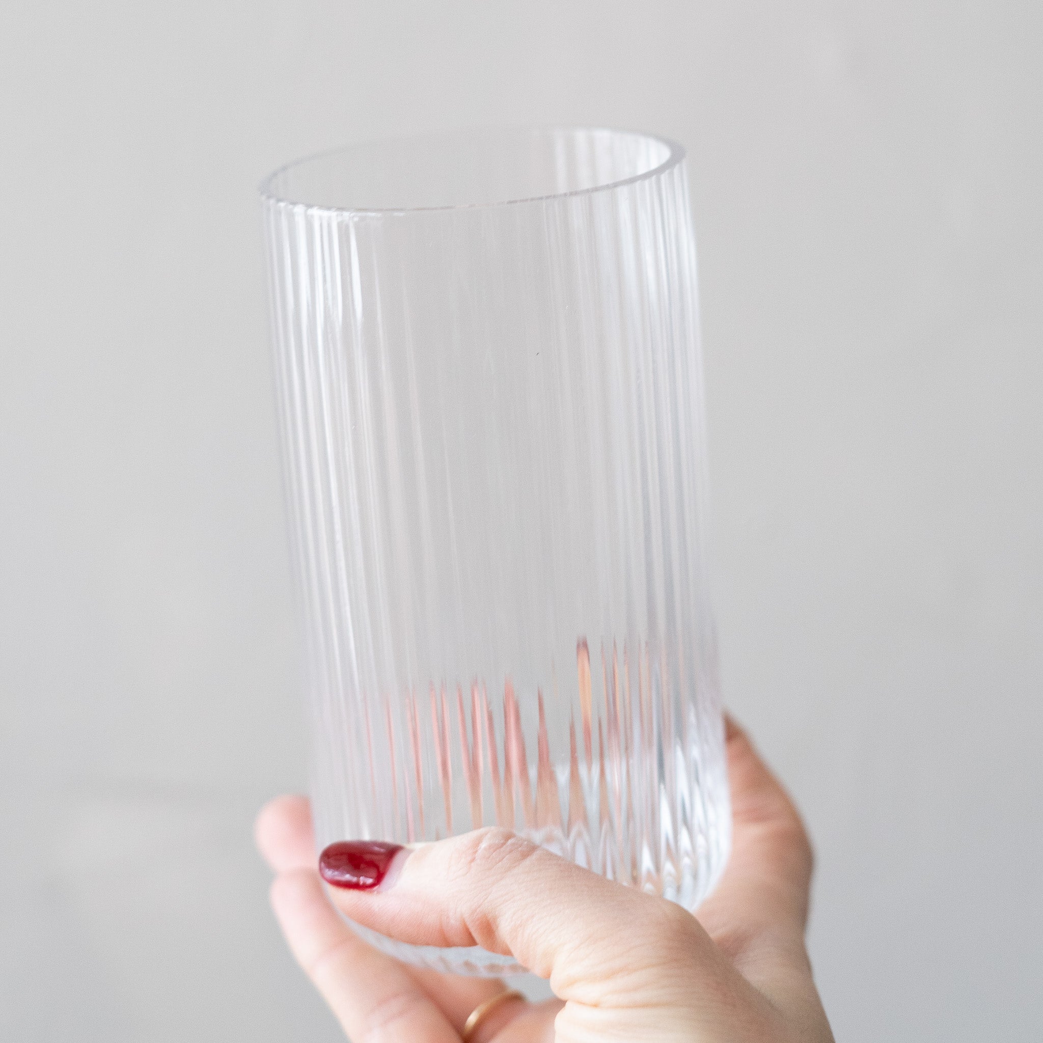 Sip in the intricate ridges and sparkling hues of this contemporary highball glass. A member of the fluted glassware series, this translucent tumbler is handcrafted with a wave-like design.