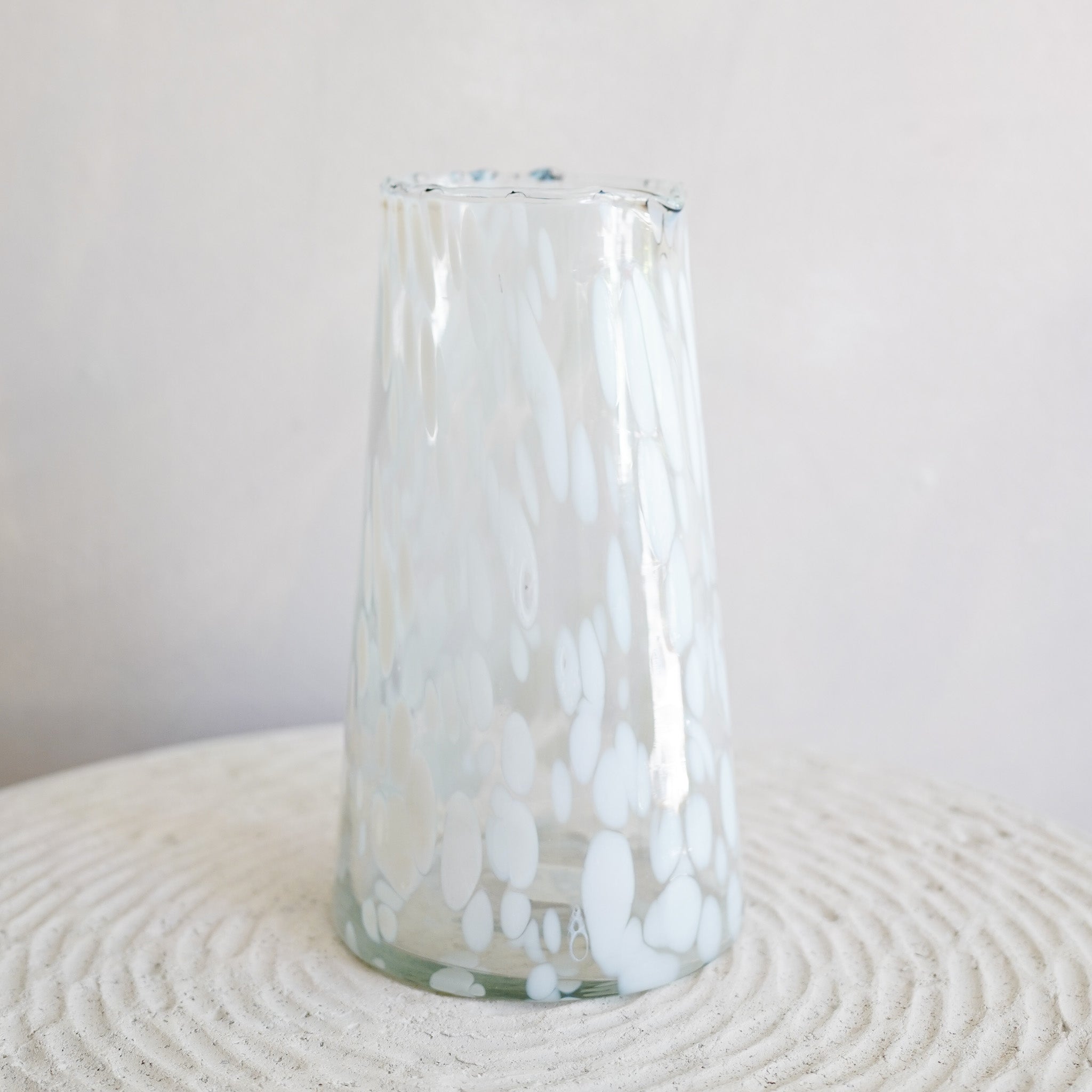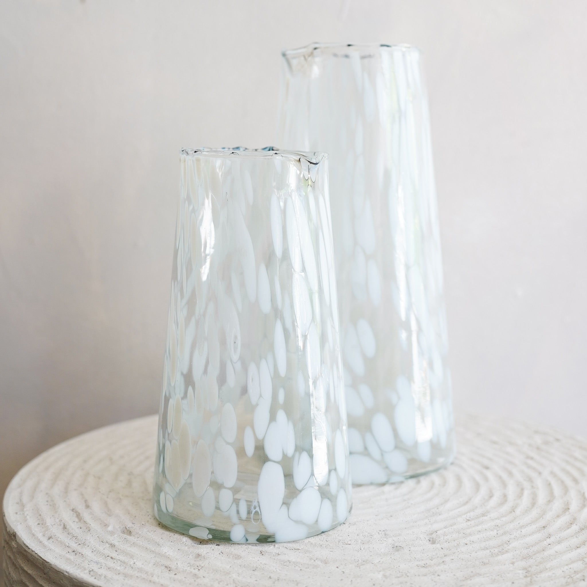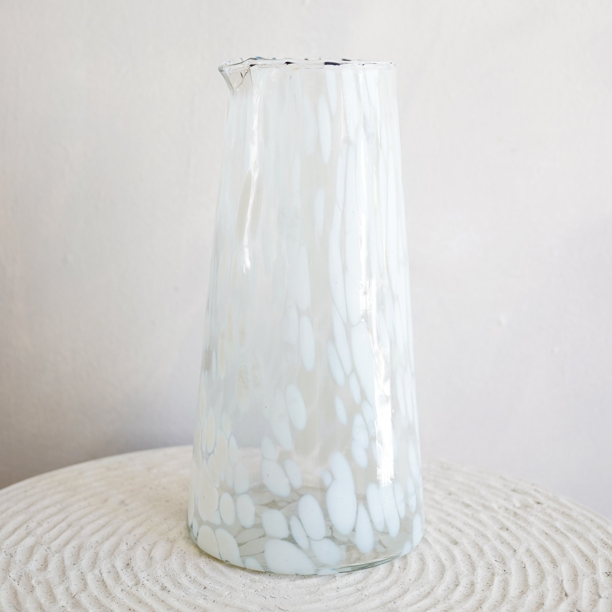 Beautifully handcrafted in India, the Confetti Caraffe is handblown with a snowstorm confetti design of milky white glass - the variations from the artisans' touch bringing life and soul to the piece. We love the contemporary style it brings when styled with long stemmed blooms or when used to serve water at the dinner table. Each piece is unique and brings rich style to your home. Dishwasher Safe.
