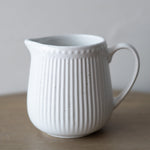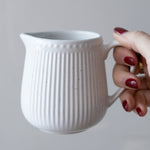 This 10 ounce stoneware creamer features a beautiful fluted texture and subtle speckled glaze. Pair it with our White Speckled Sugar Pot.