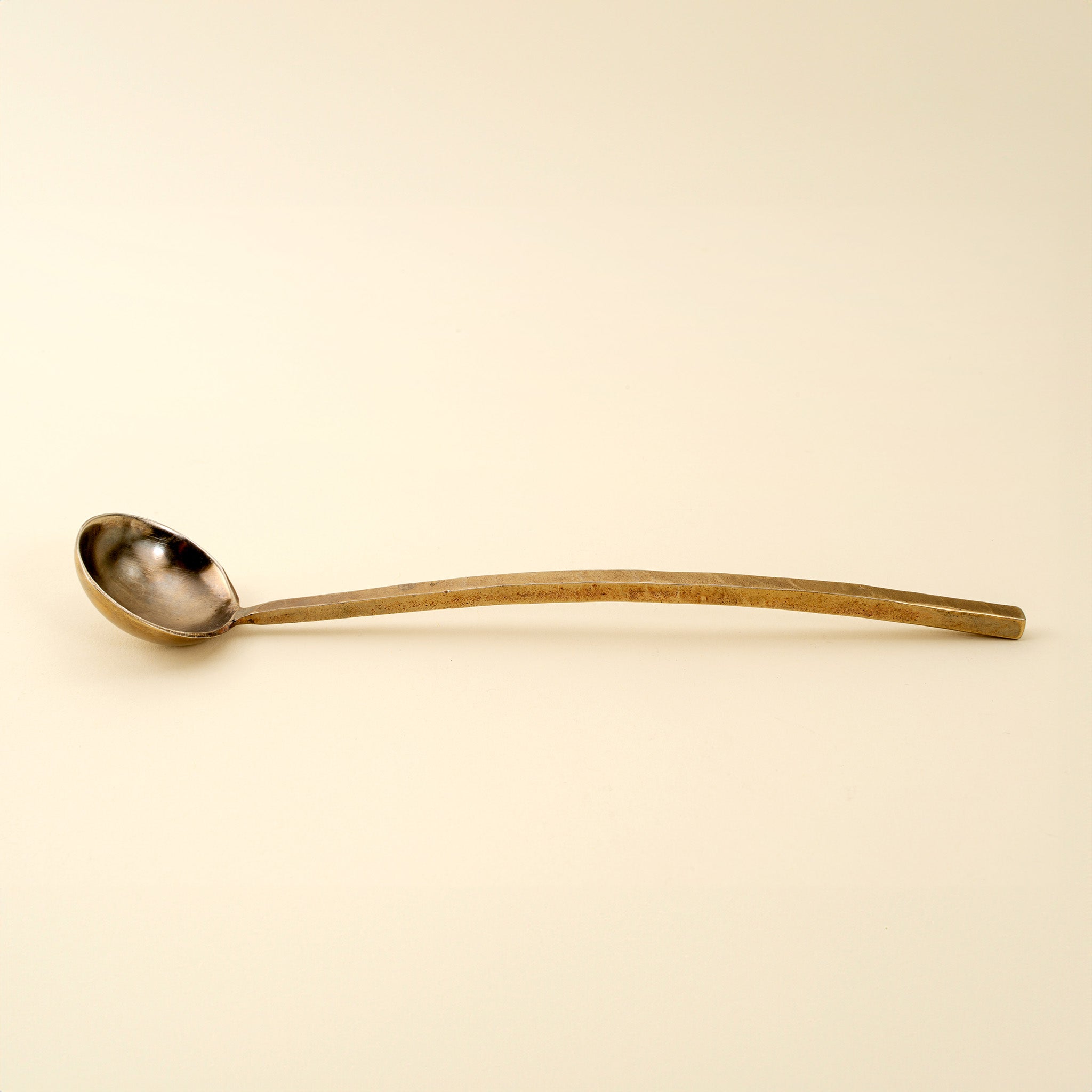 Bring character and charm to your accent decor with the Aged Iron Long Spoon. Featuring an antique brass finish and an organic, hand-forged shape, this stylized teaspoon is designed to delight, whether resting in a sugar jar or styled on a shelf.