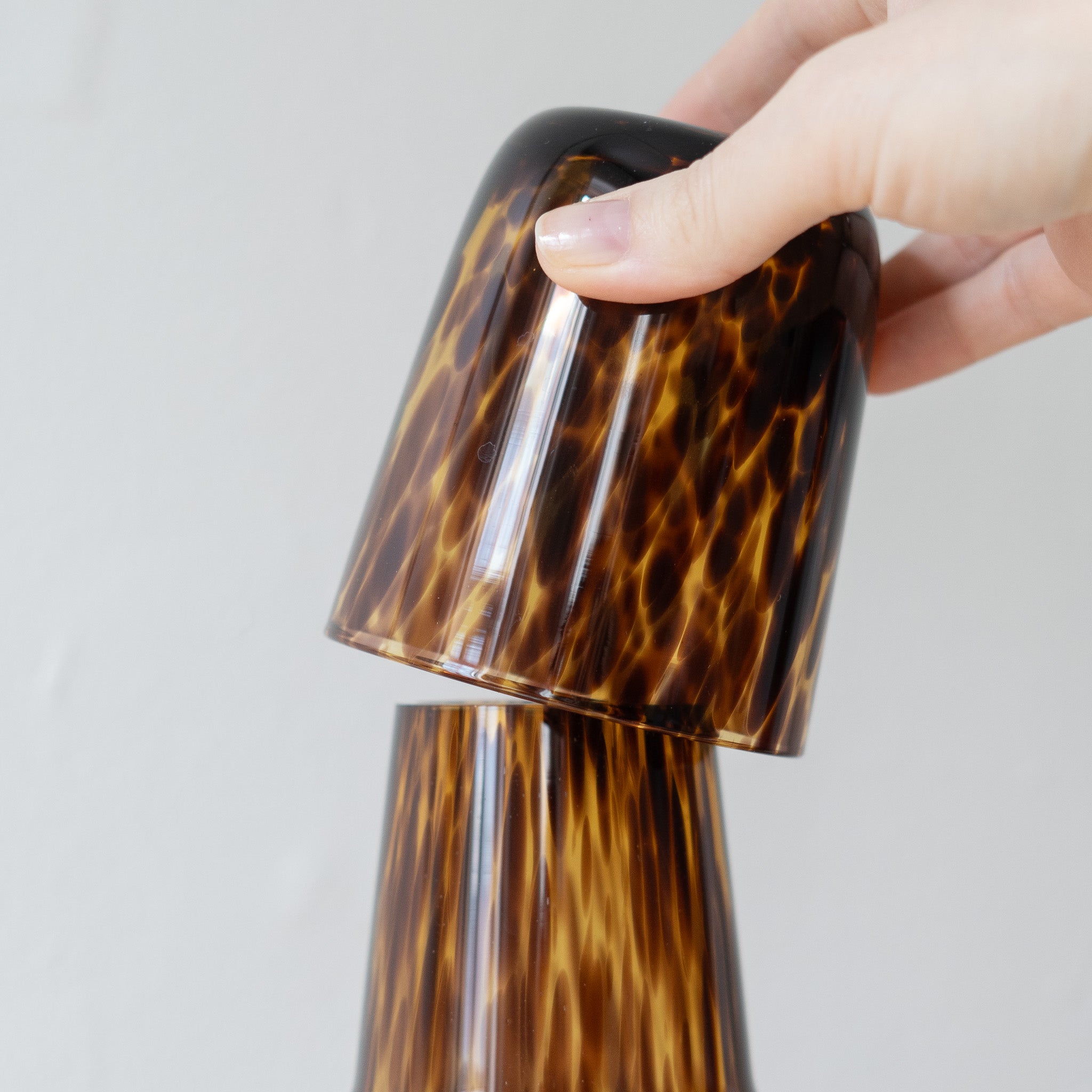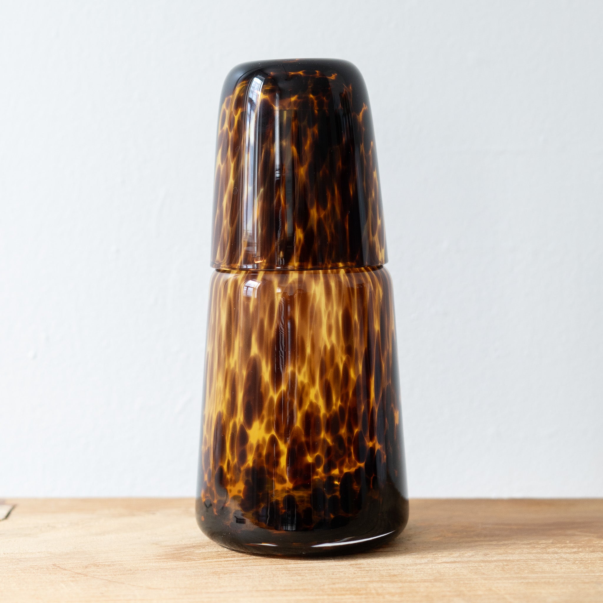 A bedside essential that combines function with understated elegance. This carafe and cup set features hand-crafted glass with a subtle textured surface in warm amber tones. The matching cup doubles as a lid to keep your water fresh throughout the night. Hand wash recommended.