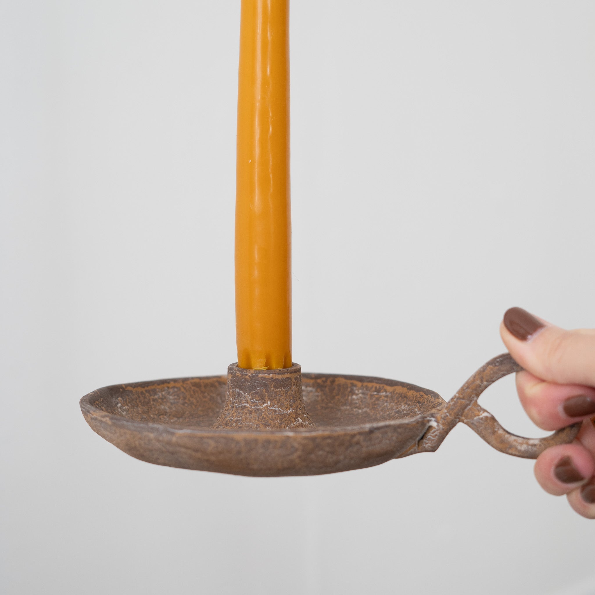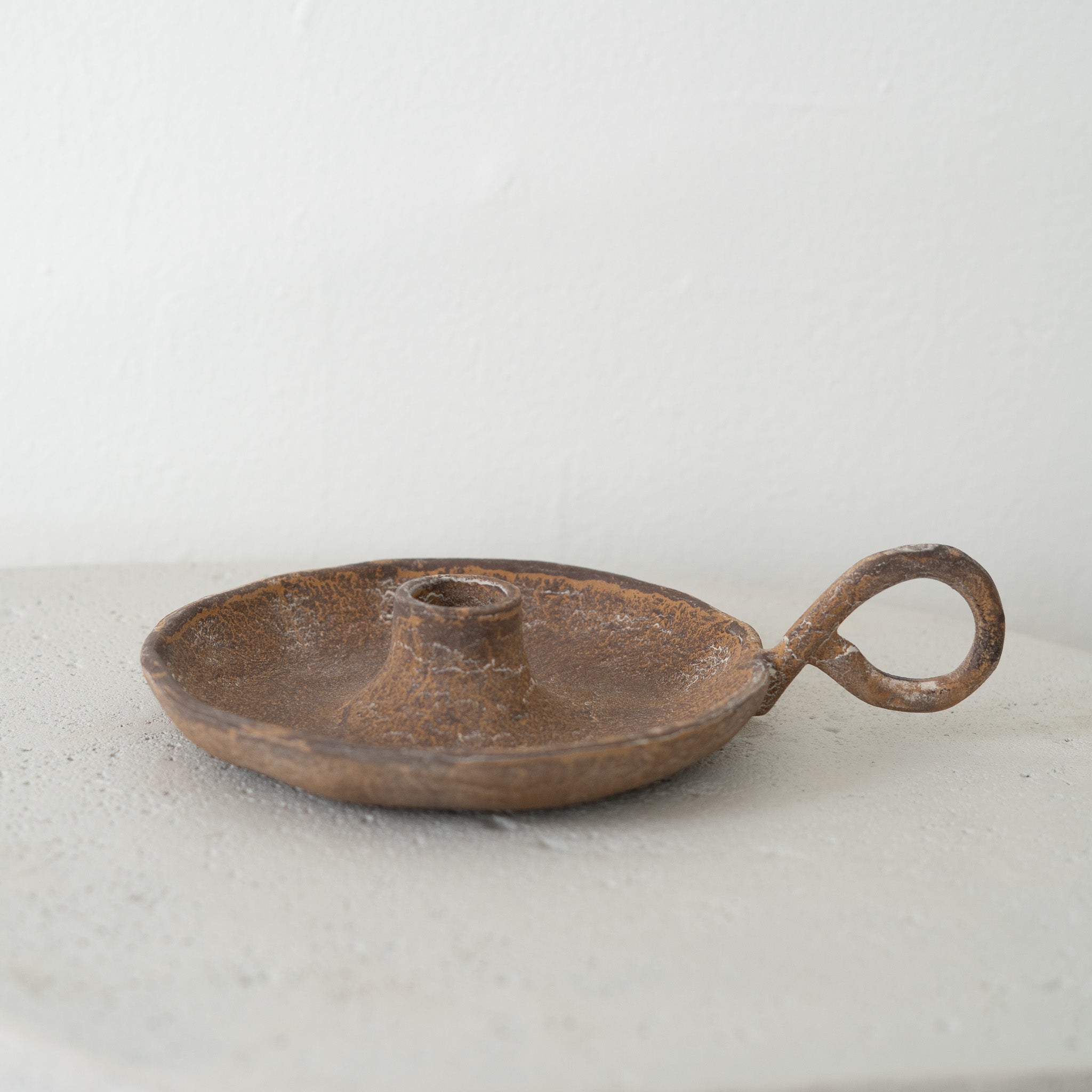 The Caribe Taper Candle Holder in Raw Umber features a handcrafted sand-cast design with a rich patina and looped handle. Made for taper candles, it adds elegant warmth and vintage charm to any room.