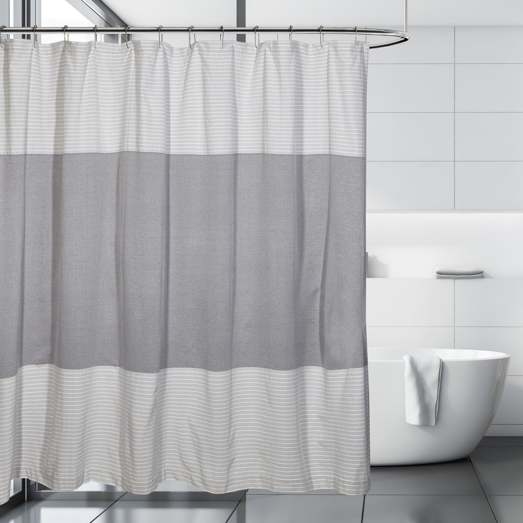 The Ranier Stripe Shower Curtain is crafted from a 230 gsm poly-cotton blend and measures 72" x 72", combining durability with refined style for your bathroom.