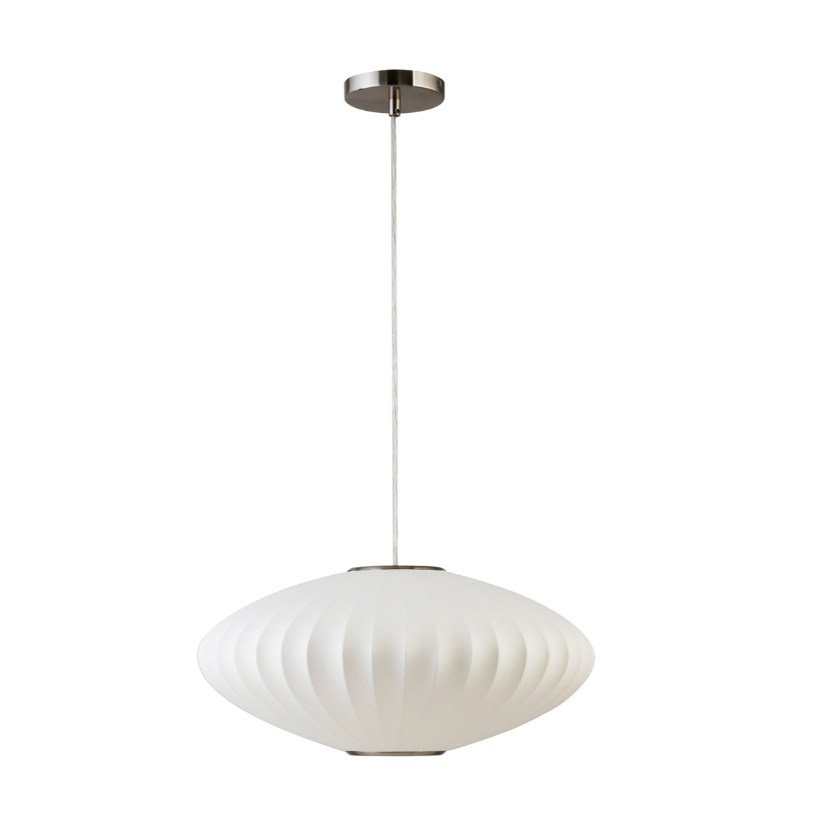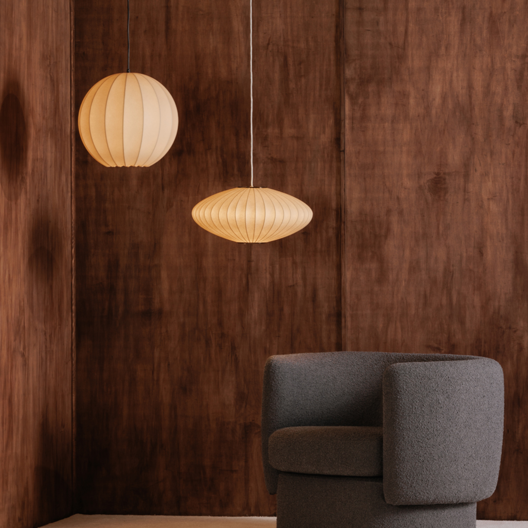 The Lys pendant lamp exudes mid-century charm with a sense of ethereal lightness. Its cocoon-like design is crafted with delicate materials to create an enchanting, airy atmosphere. Effortlessly blending vintage inspiration with modern sophistication, its captivating form evokes a sense of serenity and weightlessness.