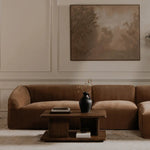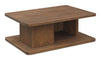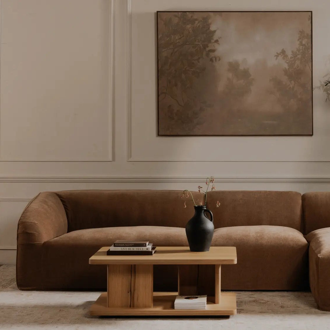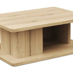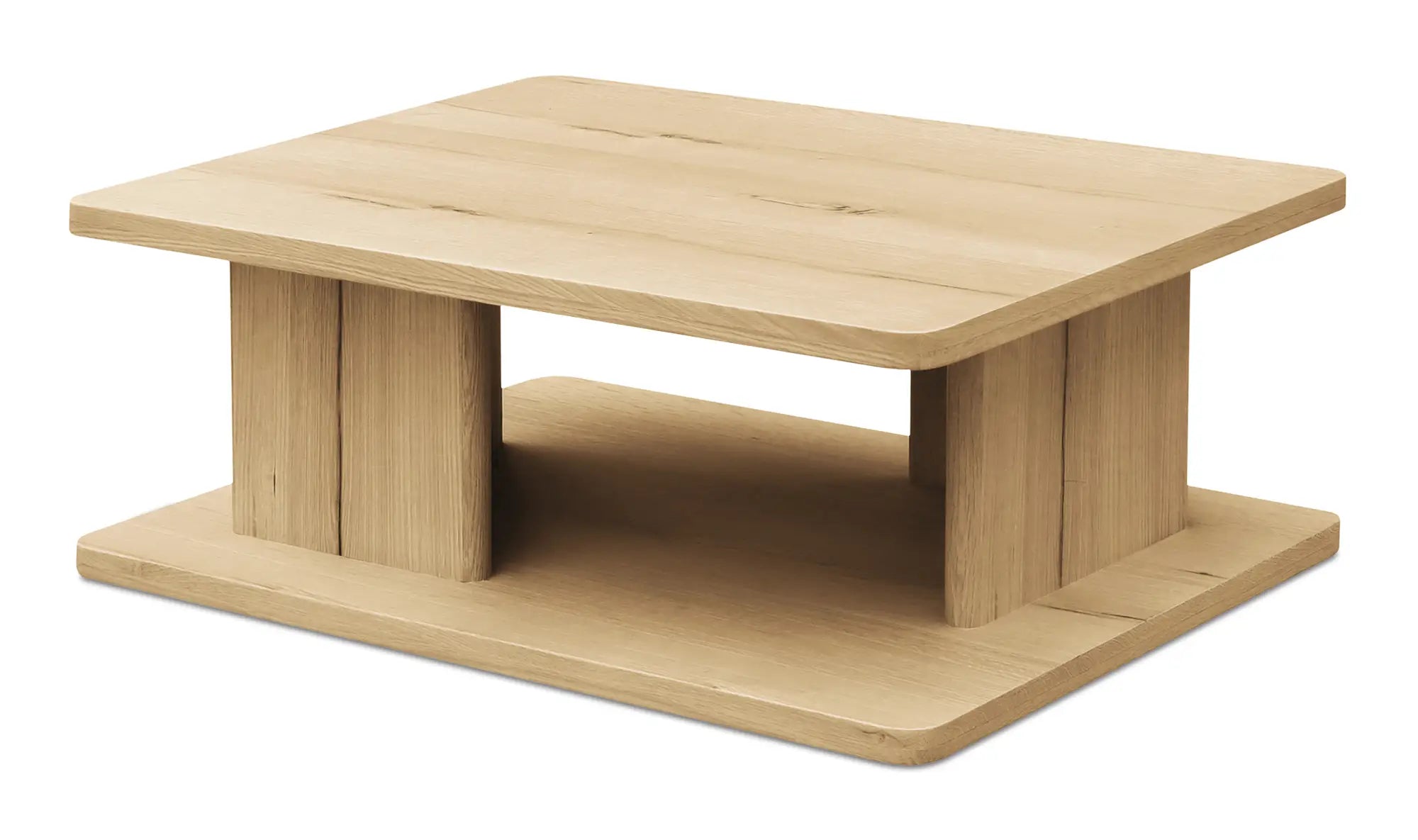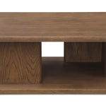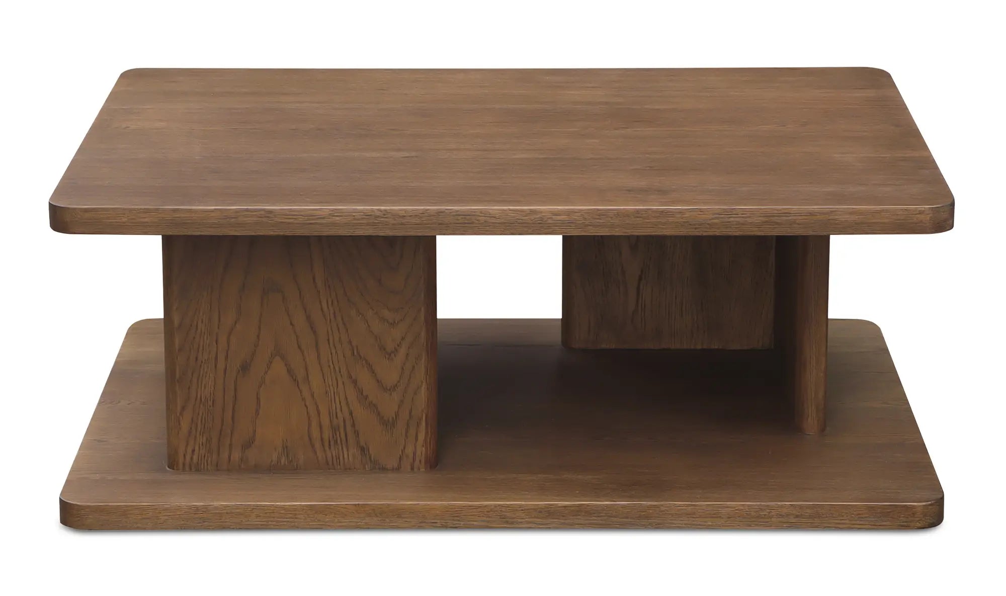 The Casey coffee table harmoniously blends rustic charm with contemporary aesthetics. A distinctive vertical support adorned with a refined bullnose edge adds sculptural grace to its minimalist design. Ample open storage beneath the tabletop offers practical display or storage solutions.