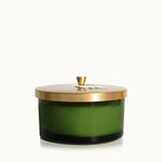 Enjoy the elegant scent of Frasier Fir with this 4-wick candle, featuring notes of Siberian fir, cedarwood, and sandalwood in a deep green glass container with a gold lid.