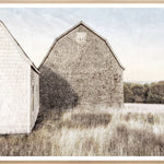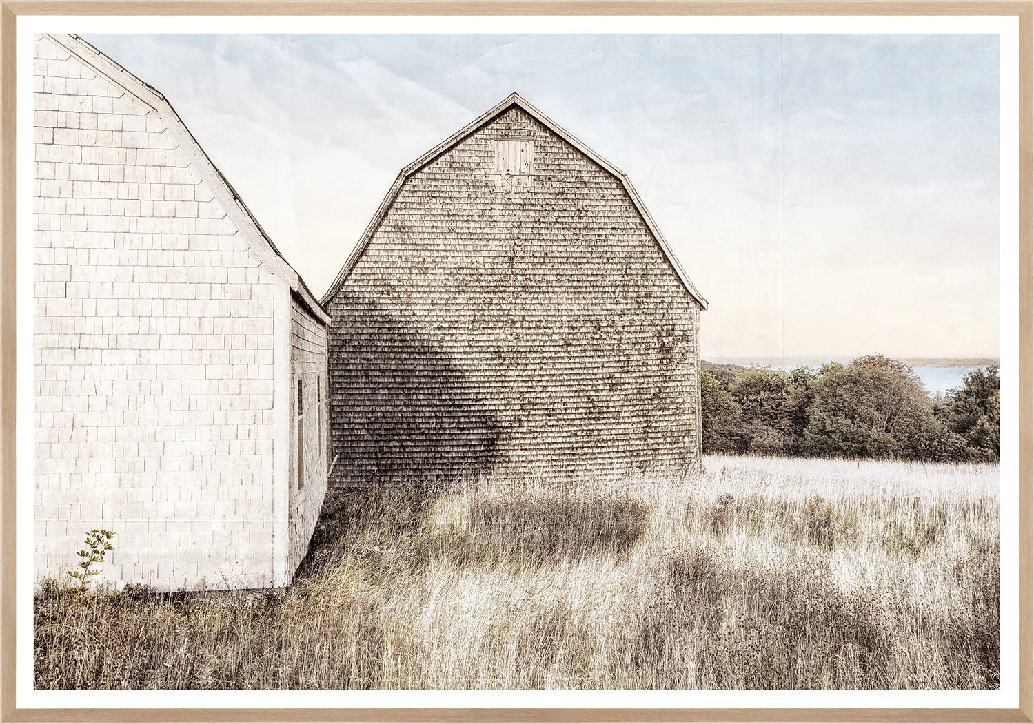 This weathered photograph features a quaint, charming farmhouse in tones of blue, cream, and muted browns. The creased paper texture and soft colours add a surreal, dream-like quality.