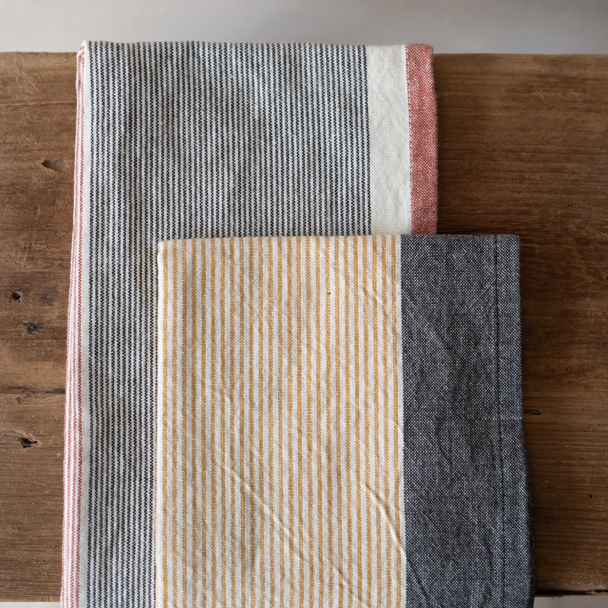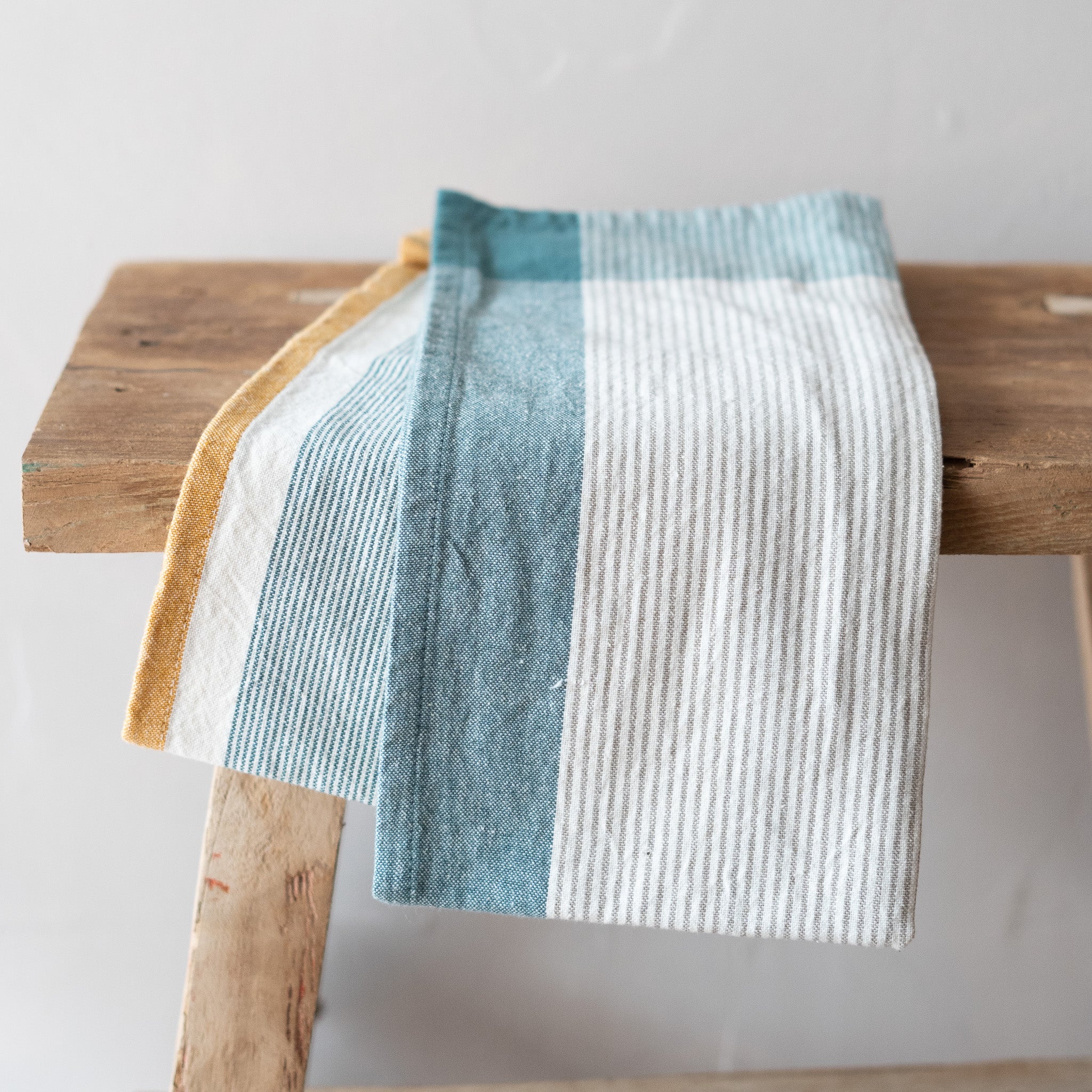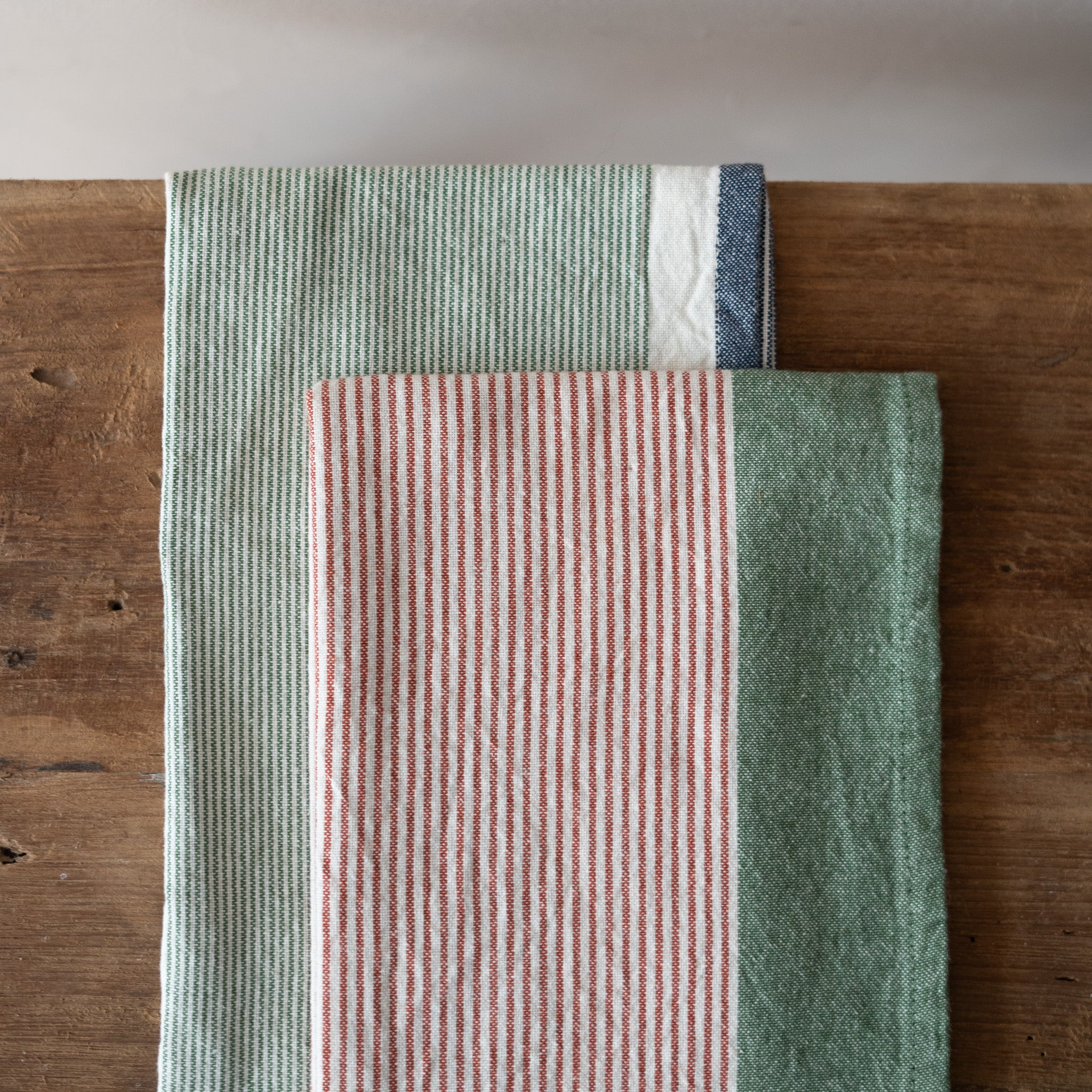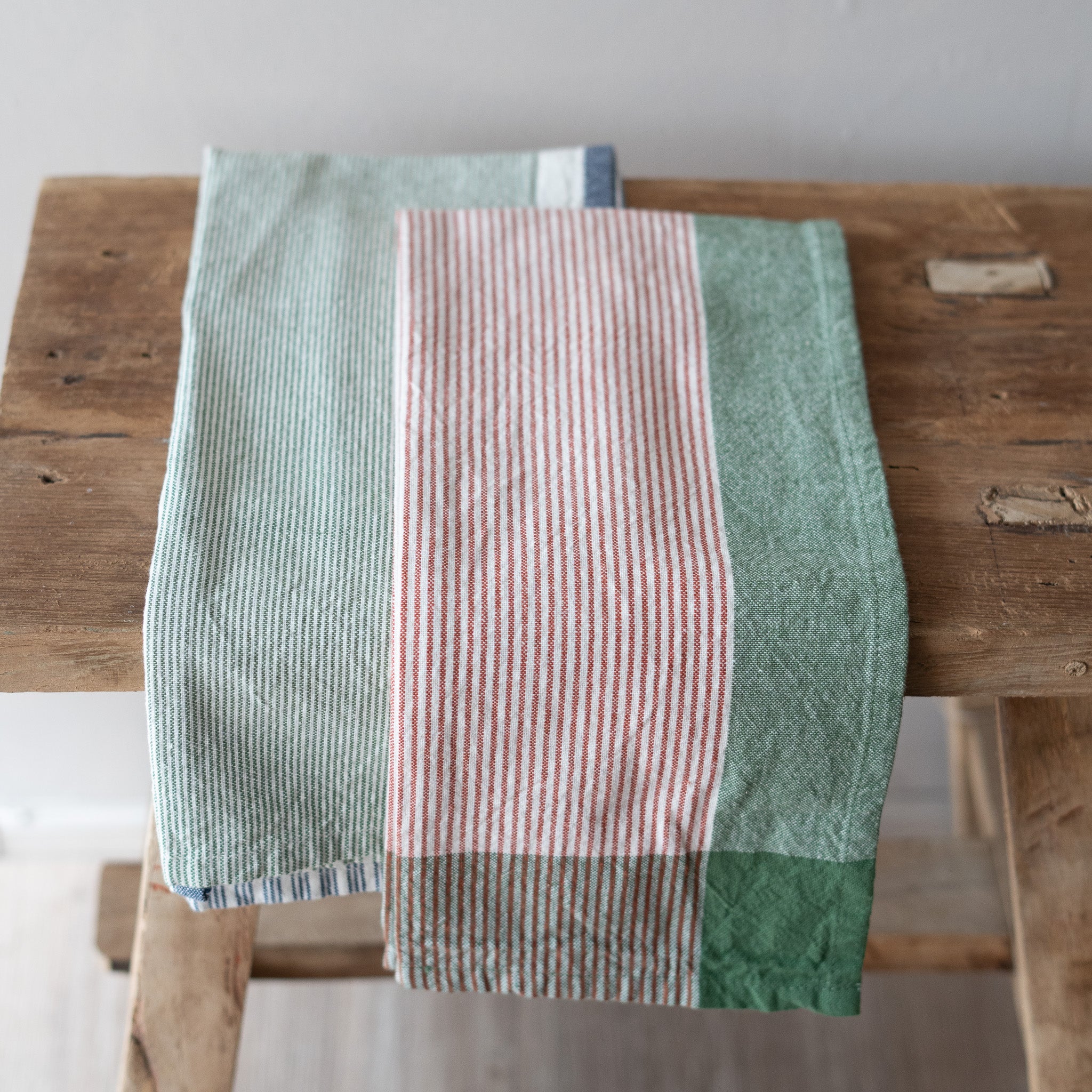 A hint of vintage meets the modern kitchen in these subtly-striped and banded collection of dishtowels in shadow, lagoon, jade, and nectar.