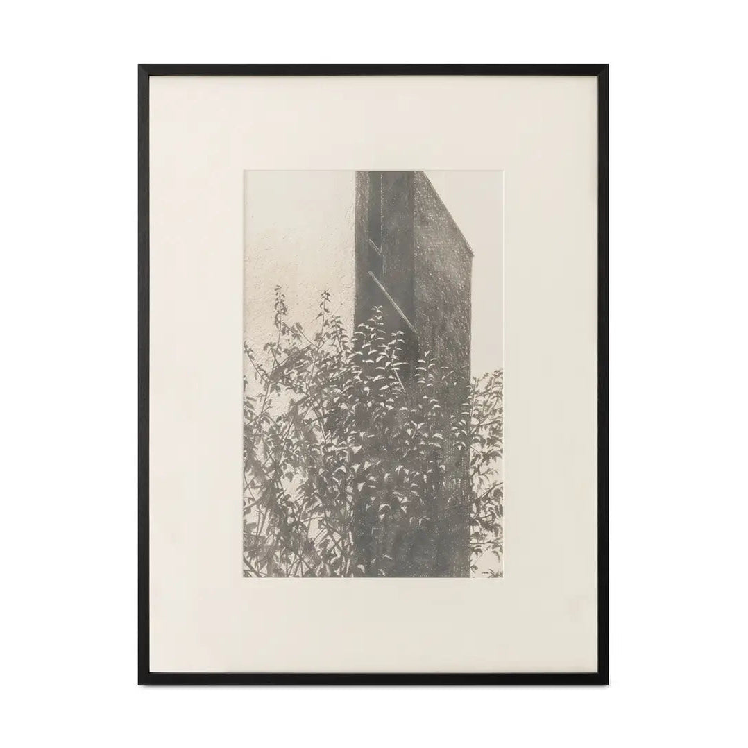 Retreat 1 framed print transports to a sun-drenched European escape. Delicate, sketch-like strokes capture a charming secluded home, its windows offering glimpses of tranquility. Encased in solid wood, its natural grain complements the image, while a textured matte border adds depth. More than decor, it's an invitation to pause—a visual retreat amidst life's bustle.