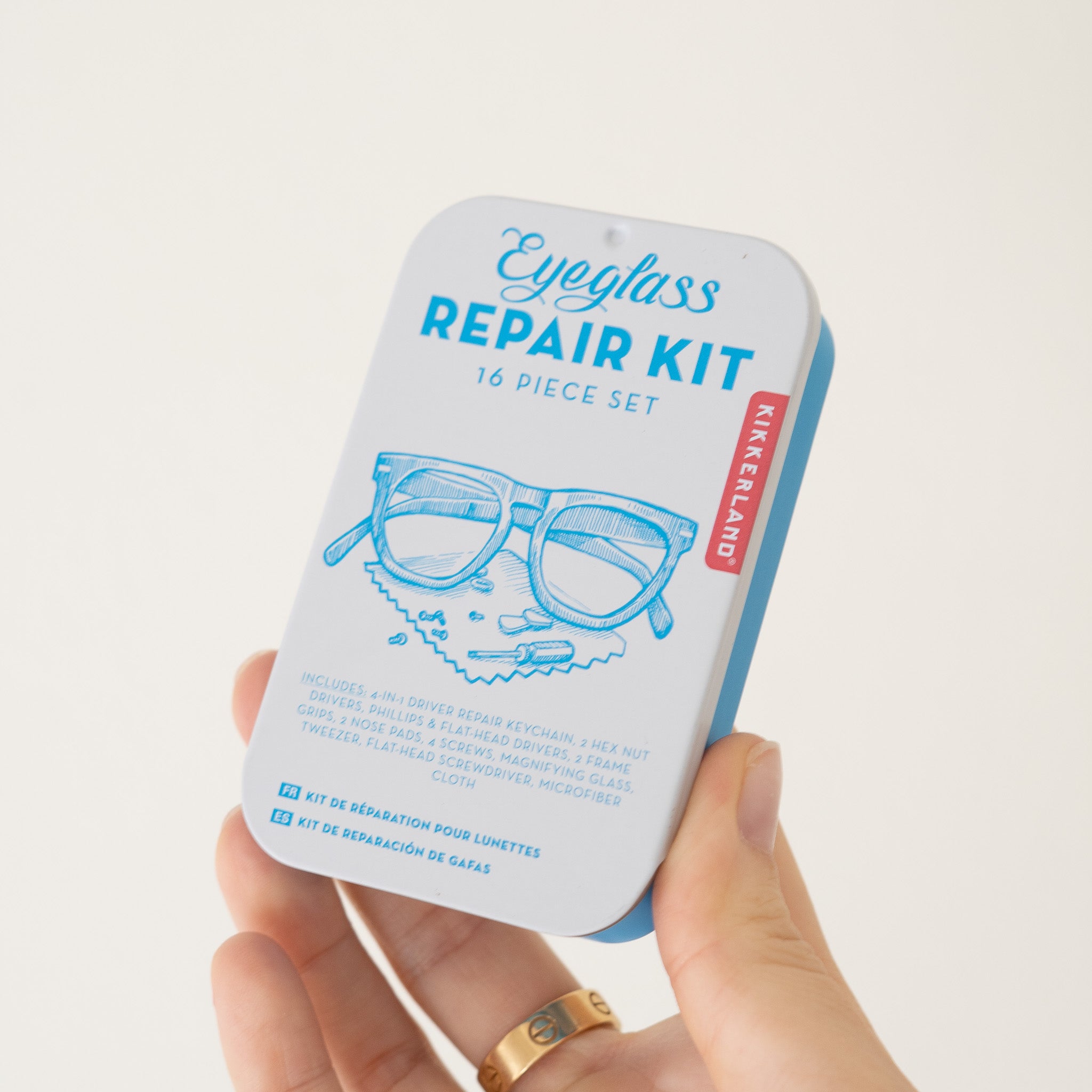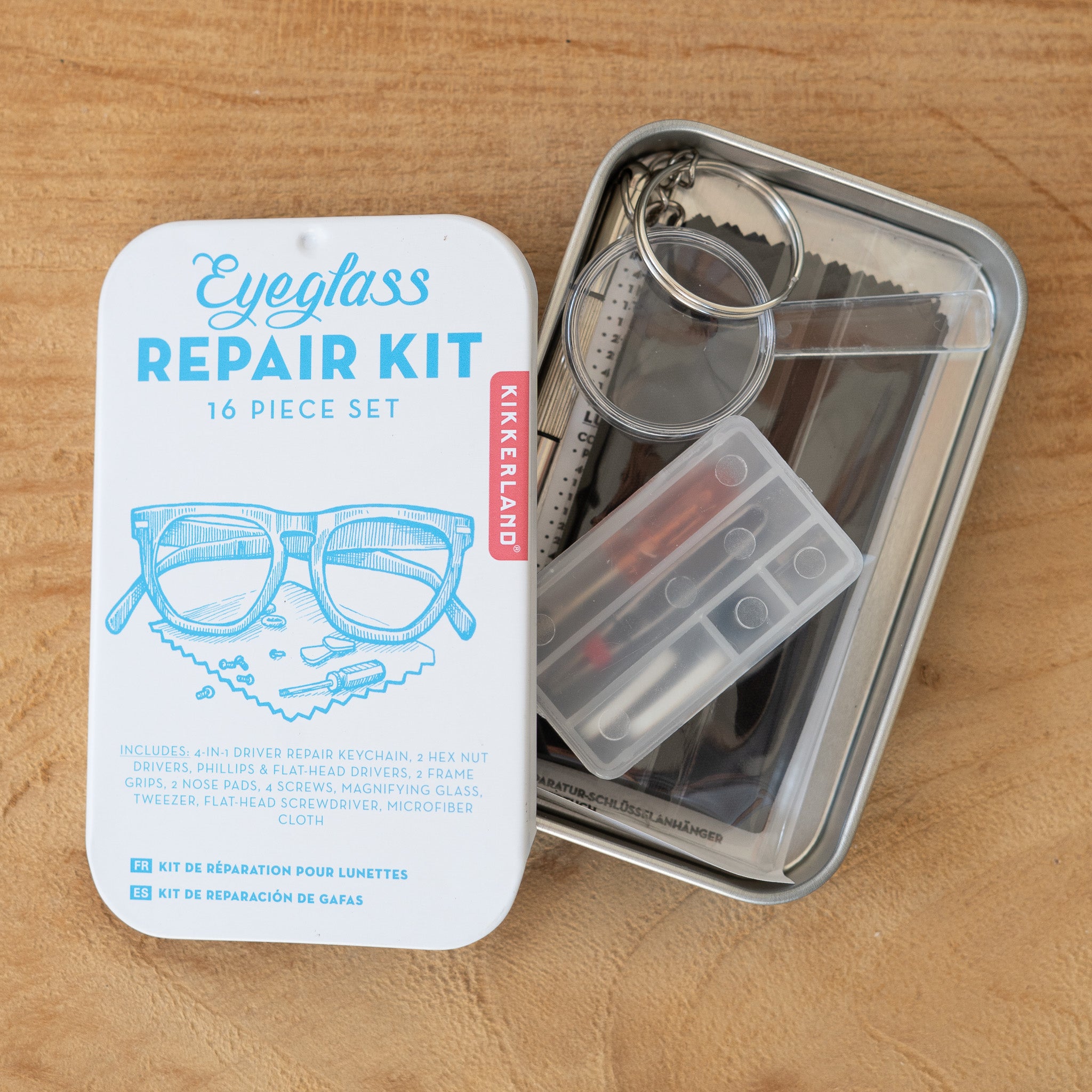 This handy tin kit features everything you need for a quick eyeglass repair. Contents include: 1 Flat head screwdriver, 1 pair of tweezers, 2 nose pads, 2 Frame grips, 4 Screws, 1 Magnifying glass, 1 Philips-head screwdriver, 1 Microfiber cloth.
