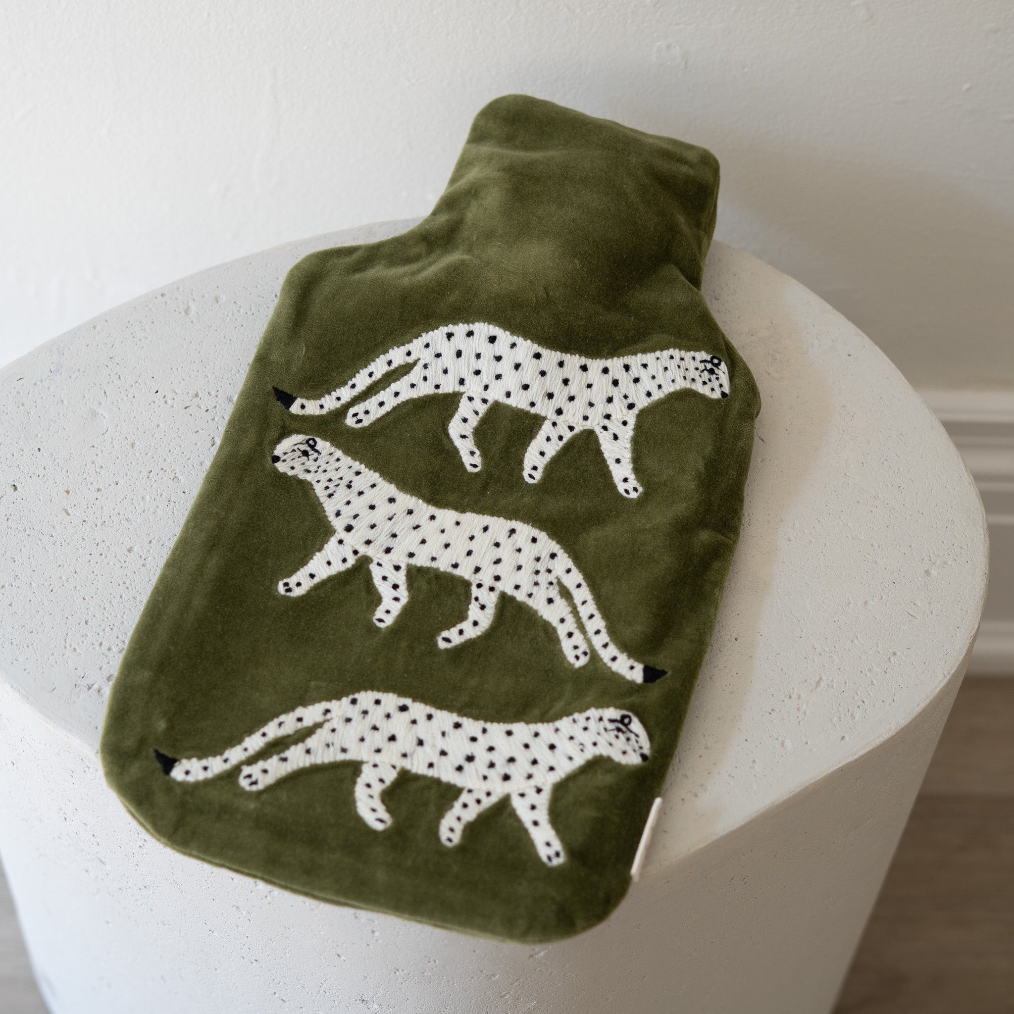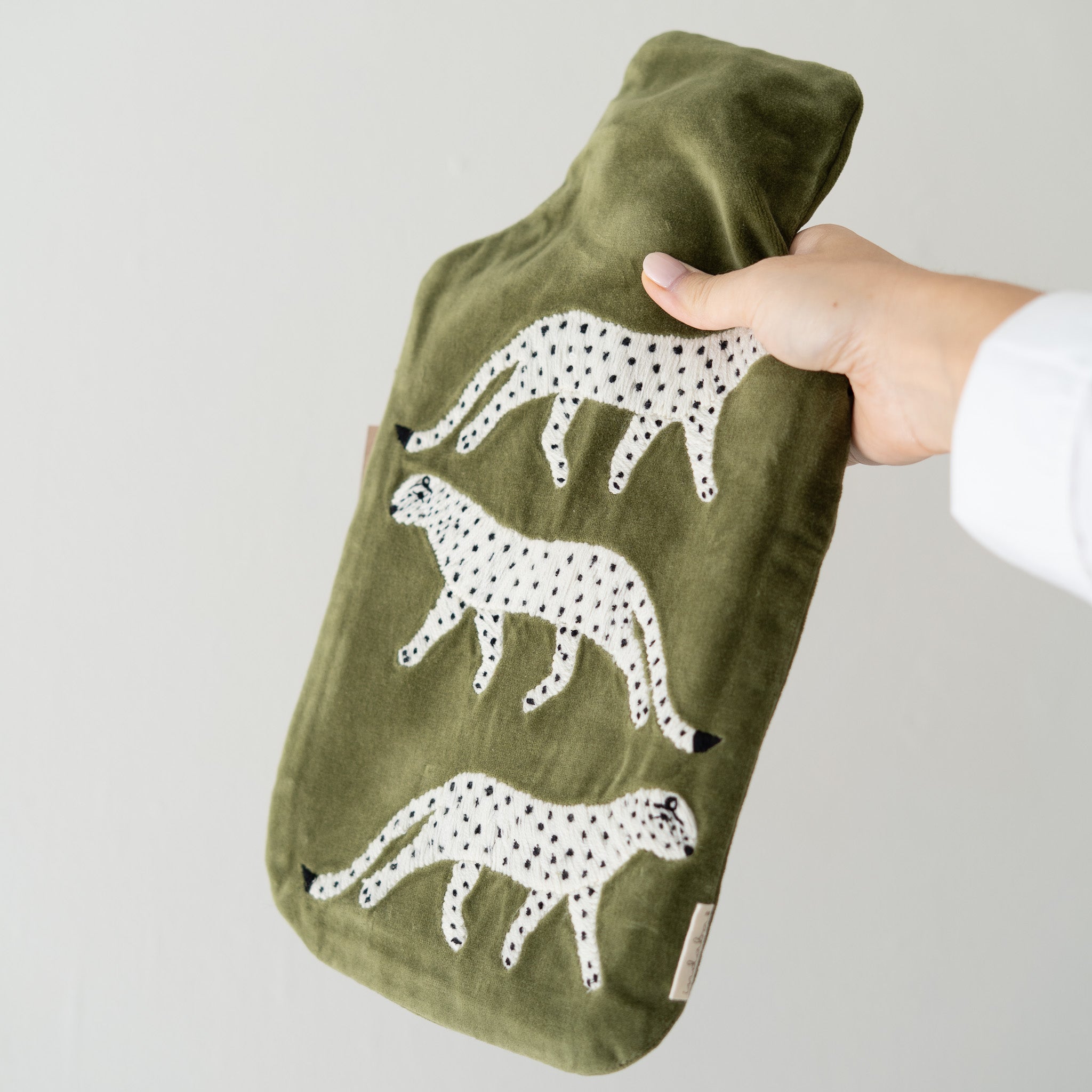 Stay cozy in style with the Leopard Velvet Hot Water Bottle. Its soft olive green velvet and hand-embroidered leopard add a fun, fancy touch while keeping you warm and relaxed. Perfect for soothing aches or just chilling out!