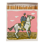 Our signature square matchbox featuring a cowboy sitting atop a white horse with a pink sky in the background. Beautifully inspired by vintage matchbox labels.
